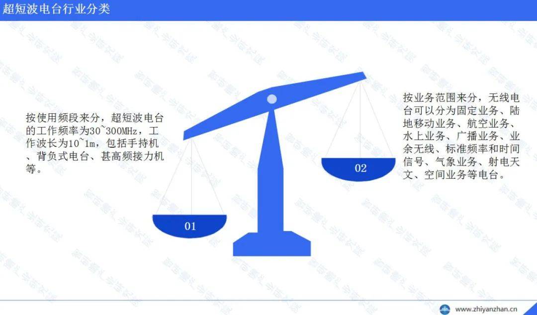 主頁(http://www.www.jjxinkai.com):中國超短波電臺:軍品業(yè)務(wù)占比為80.52% 超短波電臺行業(yè)定義 超短波電臺是一種無線電通信設(shè)備,其工作波長范圍為10~1米,頻率范圍為30~300兆赫。該設(shè)備由收發(fā)信機(jī)、天線和電源等多個組成部分構(gòu)成。與短波相比,超短波電臺的通頻帶更寬,能夠傳輸更穩(wěn)定的信號。在調(diào)制制度方面,超短波電臺可采用調(diào)幅、調(diào)頻和單邊帶等不同的方式,其中以調(diào)頻制最為常用。這種調(diào)制方式具有優(yōu)異的抗干擾性能,相比于調(diào)幅制和單邊帶制更加優(yōu)越。因此,超短波電臺在通信傳輸中具有很高的穩(wěn)定性和可靠性,被廣泛應(yīng)用于軍事、民用等領(lǐng)域。 超短波電臺行業(yè)分類 超短波電臺的分類主要有兩種,一種是根據(jù)使用頻段進(jìn)行分類,另一種是根據(jù)業(yè)務(wù)范圍進(jìn)行分類。按使用頻段來分,超短波電臺的工作頻率為30~300MHz,工作波長為10~1m,包括手持機(jī)、背負(fù)式電臺、甚高頻接力機(jī)等。按業(yè)務(wù)范圍來分,無線電臺可以分為固定業(yè)務(wù)、陸地移動業(yè)務(wù)、航空業(yè)務(wù)、水上業(yè)務(wù)、廣播業(yè)務(wù)、業(yè)余無線、標(biāo)準(zhǔn)頻率和時間信號、氣象業(yè)務(wù)、射電天文、空間業(yè)務(wù)等電臺。