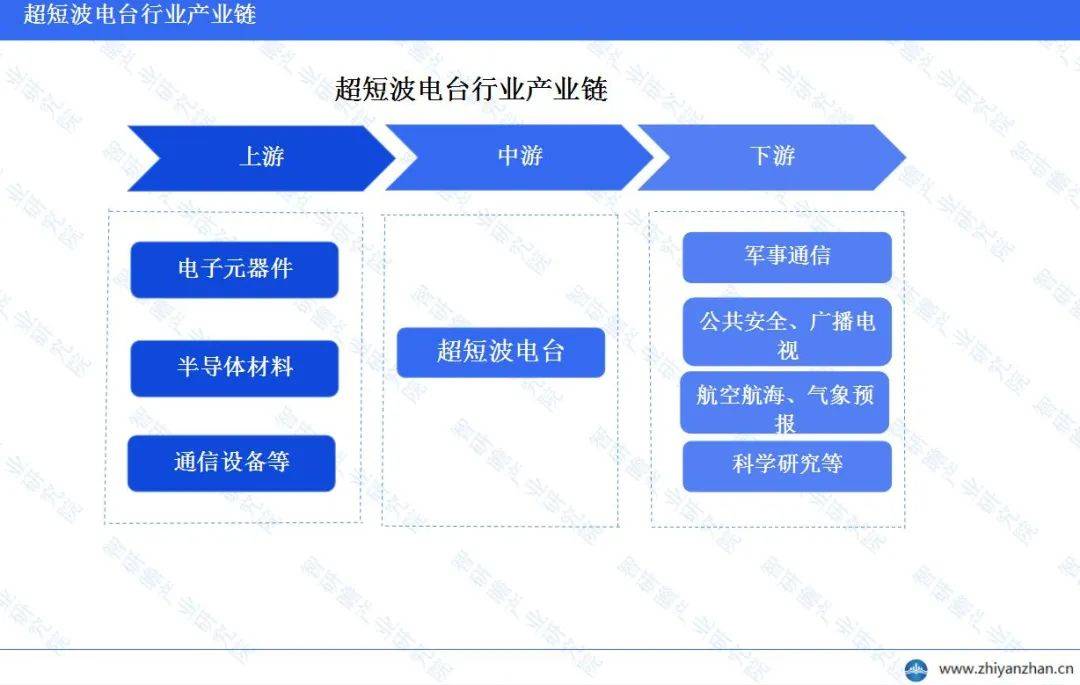 超短波電臺行業(yè)上中下游 超短波電臺的上游行業(yè)主要包括電子元器件、半導(dǎo)體材料、通信設(shè)備等,這些行業(yè)為超短波電臺的生產(chǎn)提供了必要的原材料和技術(shù)支持。而超短波電臺下游應(yīng)用行業(yè)則非常廣泛,包括軍事通信、公共安全、廣播電視、航空航海、氣象預(yù)報(bào)、科學(xué)研究等多個領(lǐng)域,其穩(wěn)定的傳輸性能和廣闊的覆蓋范圍使其在這些行業(yè)中發(fā)揮了重要的作用。