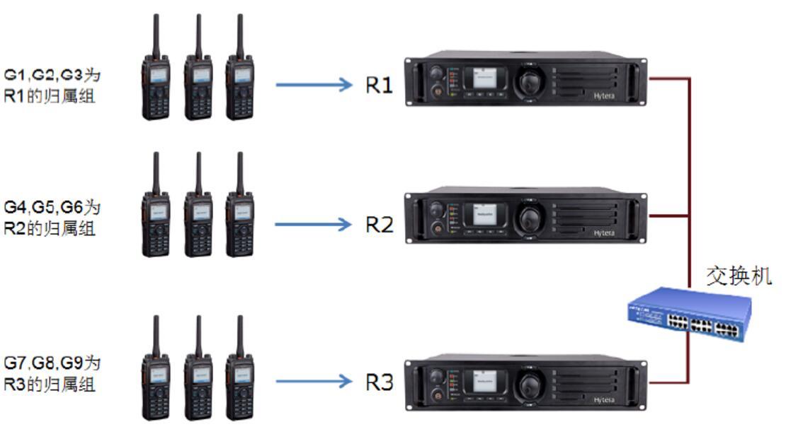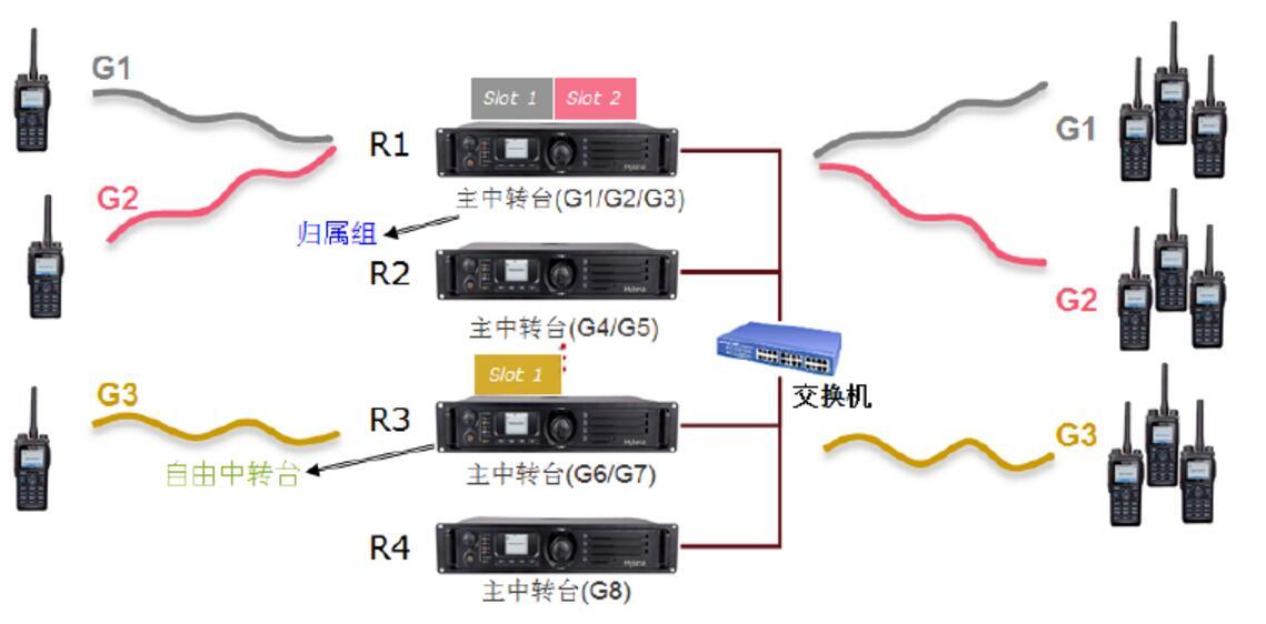 ◆主中轉(zhuǎn)臺(tái) XPT站點(diǎn)內(nèi)的每個(gè)終端都有自己的主中轉(zhuǎn)臺(tái)。例如:我們分配R1為G1,G2,G3的主中轉(zhuǎn)臺(tái)。當(dāng)終端的主中轉(zhuǎn)臺(tái)為空閑狀態(tài)時(shí),終端總是優(yōu)先監(jiān)聽它的主中轉(zhuǎn)臺(tái),并根據(jù)主中轉(zhuǎn)臺(tái)的系統(tǒng)廣播判別當(dāng)前XPT系統(tǒng)中是否有它的呼叫。當(dāng)主中轉(zhuǎn)臺(tái)存在空閑時(shí)隙時(shí),終端總是優(yōu)先在它的主中轉(zhuǎn)臺(tái)上發(fā)起呼叫。 ◆歸屬組 在一個(gè)XPT站點(diǎn)中,一個(gè)中轉(zhuǎn)臺(tái)可以指定一個(gè)或多個(gè)歸屬組,指明該中轉(zhuǎn)臺(tái)下活動(dòng)的終端用戶組。一個(gè)用戶組只能作為一個(gè)中轉(zhuǎn)臺(tái)的歸屬組,同一個(gè)站點(diǎn)內(nèi)的不同中轉(zhuǎn)臺(tái)的歸屬組不允許重復(fù)。例如:G1,G2,G3已經(jīng)設(shè)置為中轉(zhuǎn)臺(tái)R1的歸屬組,則不能再將它們?cè)O(shè)為其他中轉(zhuǎn)臺(tái)的歸屬組。 ◆當(dāng)某個(gè)中轉(zhuǎn)臺(tái)在空閑狀態(tài)下收到組呼請(qǐng)求時(shí),則會(huì)判斷該組呼是否屬于該站點(diǎn)內(nèi)某個(gè)中轉(zhuǎn)臺(tái)的歸屬組。如果是,則該中轉(zhuǎn)臺(tái)將告知站內(nèi)其他中轉(zhuǎn)臺(tái)它的狀態(tài)更新信息(正在中轉(zhuǎn)某個(gè)組呼),并且廣播給正在監(jiān)聽它的終端,以便于該歸屬組的成員可以接收該組呼。當(dāng)終端發(fā)起一個(gè)不是本站內(nèi)的組呼請(qǐng)求(即不是站內(nèi)某個(gè)中轉(zhuǎn)臺(tái)的歸屬組)時(shí),中轉(zhuǎn)臺(tái)將拒絕該請(qǐng)求,終端將不能發(fā)起該組呼。 ◆當(dāng)某個(gè)中轉(zhuǎn)臺(tái)在休眠狀態(tài)下收到站內(nèi)其他中轉(zhuǎn)臺(tái)正在中轉(zhuǎn)組呼的信息時(shí),則會(huì)判斷該組呼是否屬于該中轉(zhuǎn)臺(tái)的歸屬組。如果是,則該中轉(zhuǎn)臺(tái)將立即啟動(dòng)發(fā)射,廣播給正在監(jiān)聽它的終端,以便于該歸屬組的成員可以及時(shí)轉(zhuǎn)移到正在中轉(zhuǎn)組呼的中轉(zhuǎn)臺(tái)下去接收該組呼,如果不是,則該中轉(zhuǎn)臺(tái)將忽略該組呼。 ◆自由中轉(zhuǎn)臺(tái) 當(dāng)終端的主中轉(zhuǎn)臺(tái)繁忙時(shí),將切換去監(jiān)聽自由中轉(zhuǎn)臺(tái),并使用自由中轉(zhuǎn)臺(tái)的空閑時(shí)隙發(fā)起呼叫,例如:G1和0G2呼叫正在R1的時(shí)隙1和時(shí)隙2轉(zhuǎn)發(fā),G3的成員將切換到自由中轉(zhuǎn)臺(tái)R3去監(jiān)聽或發(fā)起新的呼叫,每個(gè)XPT站點(diǎn)內(nèi)任意時(shí)刻都需要指定一個(gè)自由中轉(zhuǎn)臺(tái),除非站點(diǎn)內(nèi)所有的中轉(zhuǎn)臺(tái)都被占用,在每一個(gè)局域網(wǎng)站點(diǎn)內(nèi),任何一個(gè)注冊(cè)成功且狀態(tài)為空閑的中轉(zhuǎn)臺(tái)都有資格被當(dāng)選為站點(diǎn)的自由中轉(zhuǎn)臺(tái),一個(gè)局域網(wǎng)站點(diǎn)內(nèi)同一時(shí)刻只存在一個(gè)自由中轉(zhuǎn)臺(tái)。 2)主中轉(zhuǎn)臺(tái)分配