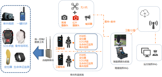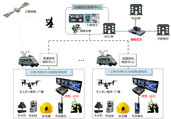 應(yīng)用示意圖 2.1 多網(wǎng)絡(luò)多維度可視化指揮 實(shí)現(xiàn)在任意時(shí)間、任意地點(diǎn)建立災(zāi)害現(xiàn)場與部局中心、總隊(duì)分中心及其它移動衛(wèi)星站雙向包括語音、數(shù)據(jù)、圖像通信綜合業(yè)務(wù)數(shù)據(jù)的互聯(lián)互通,同時(shí)能與地面有線通信網(wǎng)絡(luò)和無線通信網(wǎng)絡(luò)相結(jié)合,互為補(bǔ)充、支持,實(shí)現(xiàn)天地一體的通信網(wǎng)絡(luò)。特別提供了災(zāi)害現(xiàn)場的應(yīng)急單兵作戰(zhàn)系統(tǒng)。圍繞“快速反應(yīng)、快速機(jī)動、動中指揮、精確指揮”的目標(biāo),將衛(wèi)星通信、無線通信、計(jì)算機(jī)網(wǎng)絡(luò)等多種通信方式與廣播擴(kuò)音、音視頻采集與處理、圖像實(shí)時(shí)傳輸、通信調(diào)度管理平臺進(jìn)行優(yōu)化組合配置,構(gòu)建高效通信指揮信息化平臺。 2.2 位置信息共享 每臺無線自組網(wǎng)節(jié)點(diǎn)均可以采用GPS/北斗進(jìn)行定位,并將位置信息通過無線自組網(wǎng)系統(tǒng)傳輸共享輸出至其他無線自組網(wǎng)節(jié)點(diǎn)。 2.3 生命體征監(jiān)測 采用嵌入式微型生命體征監(jiān)測芯片,指揮中心對救援隊(duì)員生命體征心率、血壓等實(shí)時(shí)把控;救援隊(duì)員在救援現(xiàn)場遇到危險(xiǎn)時(shí),該模塊可實(shí)時(shí)預(yù)警,并通知現(xiàn)場指揮調(diào)度采取營救措施,保證現(xiàn)場救援隊(duì)員的生命安全。 現(xiàn)場指揮平板電腦是移動指揮中心的操作平臺,精確獲取救援隊(duì)員所處的位置信息、同步顯示救援環(huán)境及救援隊(duì)員生命體征狀態(tài),及時(shí)發(fā)出安全預(yù)警信息。同時(shí)指揮調(diào)度人員可通過衛(wèi)星網(wǎng)絡(luò)與遠(yuǎn)方指揮中心通信。 2.4 三級調(diào)度 總局指揮中心