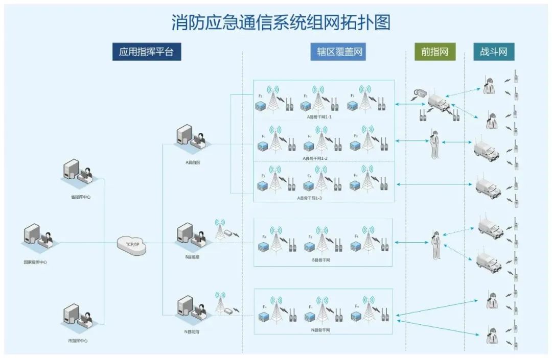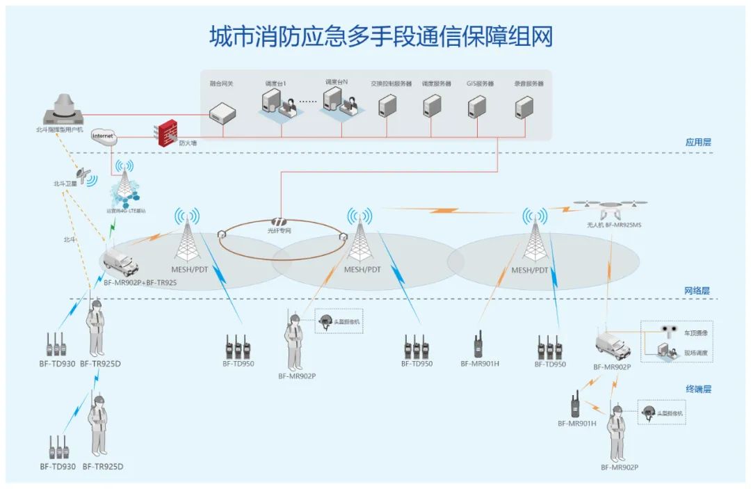 圖 消防應(yīng)急通信系統(tǒng)組網(wǎng)拓?fù)鋱D 城市消防轄區(qū)覆蓋網(wǎng)(橫向貫通、IP互聯(lián)、可聯(lián)可拆) 設(shè)計(jì)思路: 城市消防轄區(qū)覆蓋網(wǎng)以網(wǎng)格化為形式 、以行政區(qū) /縣為最小單元格,選用最節(jié)省頻率資源的同頻同播中繼基站組網(wǎng)方式為主,常規(guī)中繼基站組網(wǎng)方式為輔,采用各基站間有線/無(wú)線/專網(wǎng)鏈路相結(jié)合的 IP互聯(lián)方法,打造最優(yōu)化、最小化、最穩(wěn)定的整體技術(shù)解決方案。 方案優(yōu)勢(shì): 城市消防轄區(qū)覆蓋網(wǎng)的建成不但可以解決本級(jí)平時(shí)和戰(zhàn)時(shí)的指揮通信保障需求,還可以有效解決應(yīng)對(duì)發(fā)生大型消防事故時(shí)跨區(qū)域、跨兵種、跨建制的支援力量進(jìn)入防區(qū)后的協(xié)同指揮通信問(wèn)題。 前指指揮網(wǎng)(機(jī)動(dòng)部署、迅速建聯(lián)、高度抗毀) 設(shè)計(jì)思路: 前指指揮網(wǎng)以獨(dú)立成網(wǎng)為形式,以各級(jí)前指為最小單元,采用車載式雙頻段中繼臺(tái)為主、配備便攜式多模中繼臺(tái)為輔,利用車載中繼和便攜中繼互為接力機(jī)的功能設(shè)計(jì)來(lái)延長(zhǎng)通信距離,實(shí)現(xiàn)最適合“動(dòng)中通、迅速建聯(lián)、靠前指揮”的整體技術(shù)解決方案。 方案優(yōu)勢(shì): 前指指揮網(wǎng)在滿足滅火作戰(zhàn)任務(wù)中除了常規(guī)通信需求以外,還可以在基指和戰(zhàn)斗部/分隊(duì)之間提供越級(jí)指揮的跨接中繼服務(wù),可以實(shí)現(xiàn)千里之外的基指直接指揮到前端的單兵,同時(shí)還可以為遂行跨區(qū)域支援任務(wù)提供伴隨通信保障。在極端情況下即便骨干網(wǎng)被毀,在保持與部/分隊(duì)建聯(lián)的同時(shí)還可以通過(guò)北斗、衛(wèi)星等備用通信手段與基指建聯(lián)。 滅火戰(zhàn)斗網(wǎng)(縱向打通 、伴隨保障、分流業(yè)務(wù)) 設(shè)計(jì)思路: 滅火戰(zhàn)斗網(wǎng)以組成獨(dú)立的局域網(wǎng)為形式,以滅火分隊(duì)為最小單元,以雙頻段背負(fù)式中繼臺(tái)為主,以單兵專用手持對(duì)講機(jī)為輔,利用跨頻段中繼、本級(jí)單頻點(diǎn)中繼、窄帶自組網(wǎng)等,解決分隊(duì)對(duì)上通信問(wèn)題為主、分隊(duì)內(nèi)部單兵戰(zhàn)術(shù)通信問(wèn)題為輔,重點(diǎn)解決整個(gè)通信網(wǎng)覆蓋到最后一公里問(wèn)題。 方案優(yōu)勢(shì): 滅火戰(zhàn)斗網(wǎng)內(nèi)的單兵手持對(duì)講機(jī)通常情況下工作在同頻模式滿足分隊(duì)內(nèi)部的戰(zhàn)術(shù)通信需求,當(dāng)滅火作業(yè)面積超過(guò)同頻通信距離時(shí)可以開(kāi)啟背負(fù)式單頻點(diǎn)中繼功能、自組網(wǎng)功能以延伸信號(hào)覆蓋;背負(fù)式雙頻段中繼臺(tái)同時(shí)在另一個(gè)頻段還可以加入前指指揮網(wǎng)并具備跨接中繼功能,可以將單兵戰(zhàn)術(shù)通信接入前指指揮網(wǎng)或骨干網(wǎng)實(shí)現(xiàn)越級(jí)指揮或越級(jí)上報(bào)。 方案亮點(diǎn) 為了充分滿足平戰(zhàn)結(jié)合以及遂行多樣化任務(wù)通信保障需求,本方案采用數(shù)字超短波、MESH自組網(wǎng)、4G公網(wǎng)、北斗衛(wèi)星、衛(wèi)星通信等多種通信技術(shù)互相融合、互相補(bǔ)充、互為備份的組網(wǎng)方案,從而最大化的發(fā)揮各自技術(shù)優(yōu)勢(shì),以最小化的系統(tǒng)搭建,滿足不同場(chǎng)景下的基礎(chǔ)語(yǔ)音及窄帶數(shù)據(jù)調(diào)度、短報(bào)文最低通信保障等通信保障需求。