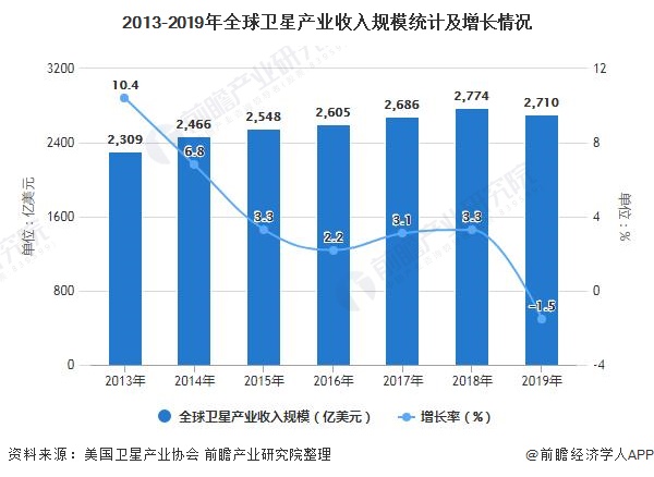 ——行業(yè)規(guī)模:整體規(guī)模增速下滑 21世紀(jì)以來,全球范圍衛(wèi)星及應(yīng)用產(chǎn)業(yè)發(fā)展迅速,呈現(xiàn)持續(xù)快速增長態(tài)勢。據(jù)美國衛(wèi)星產(chǎn)業(yè)協(xié)會(SIA)統(tǒng)計數(shù)據(jù)顯示,2019 年全球航天產(chǎn)業(yè)規(guī)模為3660 億美元,較上年增長1.7%。其中衛(wèi)星產(chǎn)業(yè)總收入2710 億美元,衛(wèi)星產(chǎn)業(yè)總收入占全球航天產(chǎn)業(yè)規(guī)模的74%,其地位的重要性不言而喻。 2013-2018年,全球衛(wèi)星產(chǎn)業(yè)收入保持逐年增長。2018年,全球衛(wèi)星產(chǎn)業(yè)收入2774億美元,同比增長3.3%。從增長速率上來看,2013-2015年,全球衛(wèi)星產(chǎn)業(yè)收入增速快速下降,到2015-2018年,收入增速趨于穩(wěn)定,保持在3%左右。2019年,受衛(wèi)星服務(wù)業(yè)及衛(wèi)星制造業(yè)收入下降影響,全球衛(wèi)星產(chǎn)業(yè)收入同比小幅下滑,收入為2710億美元。