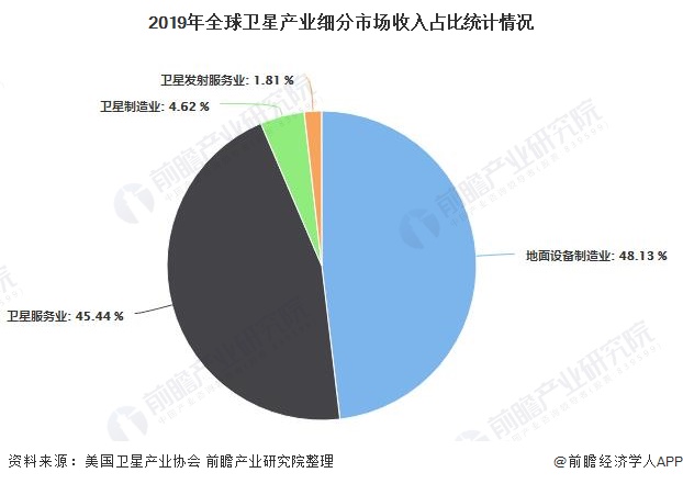 2)業(yè)結(jié)構(gòu):地面設(shè)備及衛(wèi)星服務(wù)業(yè)領(lǐng)跑細(xì)分市場 目前,全球衛(wèi)星產(chǎn)業(yè)收入主要仍來自衛(wèi)星服務(wù)以及地面設(shè)備制造業(yè)。其中地面設(shè)備,收入為1303億美元,占比為48.13%;其次是衛(wèi)星服務(wù)收入為1230億美元,占比為45.44%;衛(wèi)星制造的收入達(dá)到125億美元,占比為4.62%,仍位列第三;而衛(wèi)星發(fā)射服務(wù)仍居末位,年收入僅49億美元,占比為1.81%。