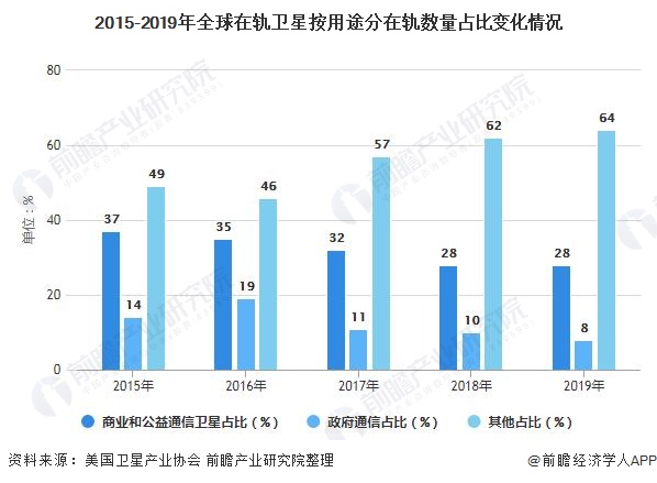4)在軌衛(wèi)星構(gòu)成:仍以通信衛(wèi)星為主 據(jù)美國衛(wèi)星產(chǎn)業(yè)協(xié)會統(tǒng)計數(shù)據(jù)顯示,2015年以來,全球在軌衛(wèi)星中仍以通信衛(wèi)星為主,2019年全球在軌衛(wèi)星中商業(yè)和公益通信衛(wèi)星占28%,穩(wěn)居第一,另外政府通信衛(wèi)星占8%,通信衛(wèi)星在軌數(shù)量合計占比為36%。