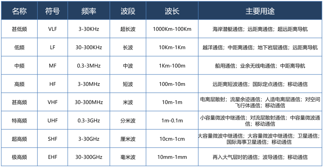 從宏觀來(lái)看,主要分為光波和電波我們?nèi)祟悷o(wú)線通信,目前主要用的是電波。早期用的低頻和中頻電磁波,現(xiàn)在逐漸往高頻甚至太赫茲(就是上圖中間的THz)發(fā)展。也有科學(xué)家,在研究可見(jiàn)光通信(往光波發(fā)展)。 無(wú)線電磁波的電波這部分,看上去頻率資源挺多的,但實(shí)際上,每個(gè)頻率,都被政府有關(guān)部門規(guī)定了對(duì)應(yīng)的用途。