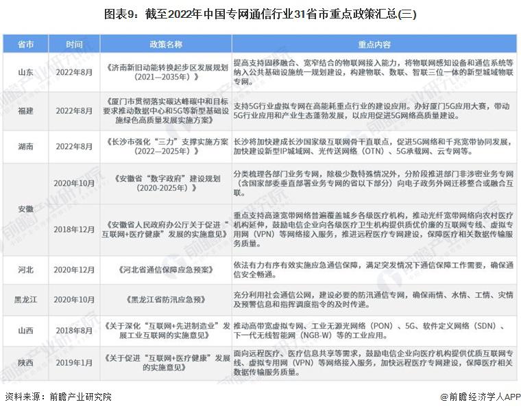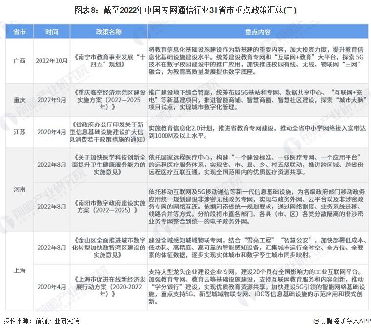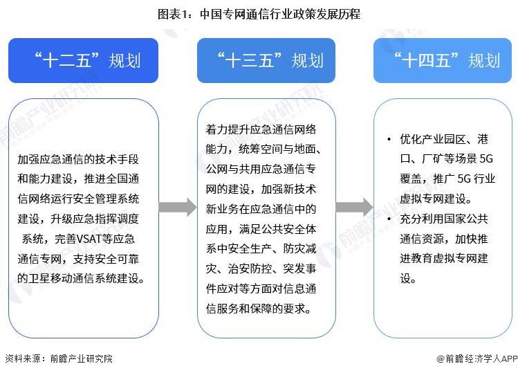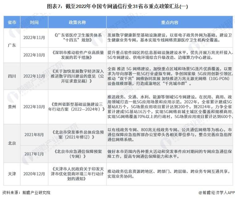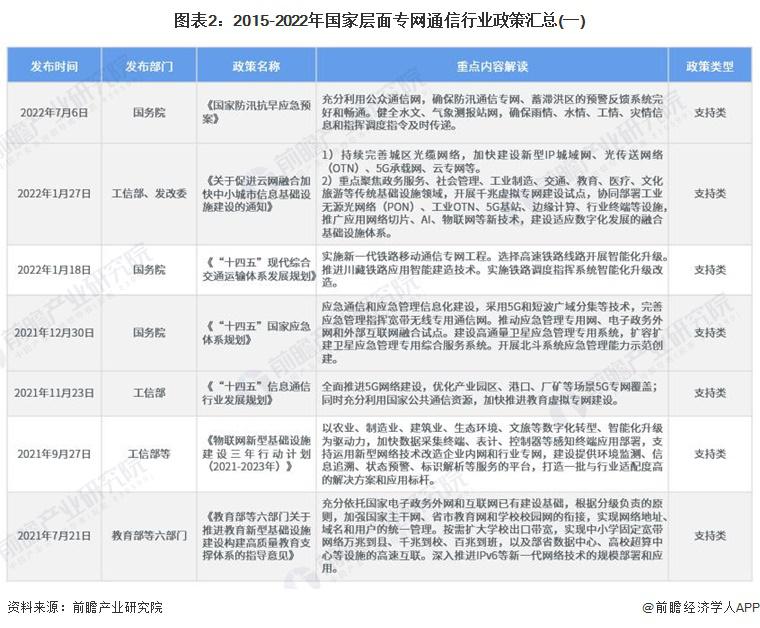 主頁(http://www.www.jjxinkai.com):重磅!2023年中國及31省市專網(wǎng)通信行業(yè)政策匯總及解讀(全)政策 行業(yè)主要上市公司:中國電信 ( 00728 ) 、中國聯(lián)通 ( 600050 ) 、中國移動 ( 00941 ) 、海能達(dá) ( 002583 ) 、海格通信 ( 002465 ) 、烽火電子 ( 000561 ) 等 本文核心數(shù)據(jù):國家層面專網(wǎng)通信行業(yè)政策匯總 ; 地方層面專網(wǎng)通信行業(yè)政策匯總 ; 國家層面專網(wǎng)通信行業(yè)發(fā)展目標(biāo)解讀 1、政策歷程圖 我國專網(wǎng)通信相關(guān)政策,隨專網(wǎng)通信產(chǎn)業(yè)下游應(yīng)用的發(fā)展而發(fā)展。2018 年以前,專網(wǎng)通信政策主要集中于應(yīng)急通信與公共安全領(lǐng)域。2017 年出臺的《國家突發(fā)事件應(yīng)急體系建設(shè) " 十三五 " 規(guī)劃》強(qiáng)調(diào)加強(qiáng)衛(wèi)星應(yīng)急專網(wǎng)的統(tǒng)籌規(guī)劃,加快城市寬帶數(shù)字集群專網(wǎng)系統(tǒng)建設(shè),提高國家應(yīng)急通信保障能力。《公安科技創(chuàng)新 " 十三五 " 專項規(guī)劃》中強(qiáng)調(diào)研發(fā)新型智能裝備,提高防控打擊綜合能力,并且加強(qiáng)對警務(wù)指揮通信等技術(shù)裝備的研發(fā)。 2018-2019 年,隨著互聯(lián)網(wǎng)教育的興起,教育專網(wǎng)的發(fā)展提上日程。2019 年,發(fā)改委發(fā)布《關(guān)于促進(jìn) " 互聯(lián)網(wǎng) + 社會服務(wù) " 發(fā)展的意見》,強(qiáng)調(diào)實施學(xué)校聯(lián)網(wǎng)攻堅行動,加快建設(shè)教育專網(wǎng),實現(xiàn)所有學(xué)校接入快速穩(wěn)定的互聯(lián)網(wǎng)。根據(jù)《" 十四五 " 信息通信行業(yè)發(fā)展規(guī)劃》,全面推進(jìn) 5G 網(wǎng)絡(luò)建設(shè),優(yōu)化產(chǎn)業(yè)園區(qū)、港口、廠礦等場景 5G 專網(wǎng)覆蓋 ; 同時充分利用國家公共通信資源,加快推進(jìn)教育虛擬專網(wǎng)建設(shè)。