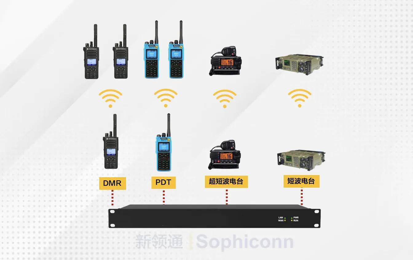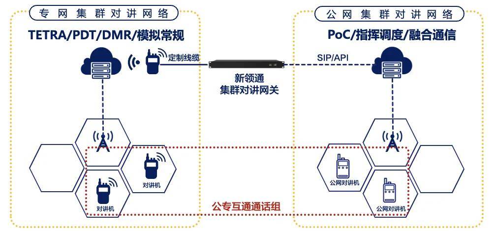 專業(yè)的無線電系統(tǒng)的制式是多種多樣的,常見的集群通信有PDT,DMR,TETRA等制式,還有短波電臺,航空電臺,航海電臺,模擬常規(guī)對講機,以及目前新興的POC公網(wǎng)對講平臺。這些對講平臺是無法互聯(lián)互通,相對獨立的。通過配置新領(lǐng)通GRW4000系列集群網(wǎng)關(guān),可以對接4種不同制式的對講機車臺/手臺,通過簡單的配置,可以實現(xiàn)任意端口的互聯(lián)互通。 方法三:與公網(wǎng)對講平臺配合使用實現(xiàn)公專網(wǎng)對講互通