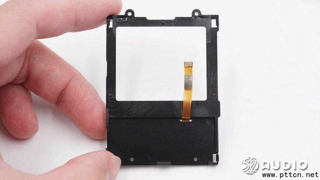 掀開屏幕,下方主板上電路一覽。屏幕和功能按鍵排線與主板通過ZIF連接器連接。屏幕背板對應主板的位置還有金屬導電海綿用來釋放靜電。
