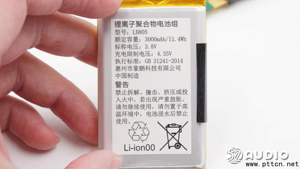對講機內置鋰離子聚合物電池組標簽上信息,型號:LB805,額定容量:3000mAh/11.4Wh,標稱電壓:3.8V,充電限制電壓:4.35V,來自惠州市豪鵬科技有限公司,中國制造。 小米對講機3的電池容量比2S提升了將近40%,4月2日我愛音頻網發(fā)布的小米對講機2S拆解中,產品電池來自于曙鵬科技,與惠州豪鵬皆屬于豪鵬科技旗下子公司。 據(jù)我愛音頻網拆解了解到,目前已有索尼、JBL、佳明、小米、大疆、飛利浦、Whoop、LG、歐樂B等知名品牌的眾多款產品采用豪鵬科技旗下的電池產品。