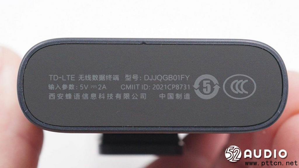 機身底部產品信息,TD-LTE 無線數(shù)據(jù)終端,型號:DJJQGB01FY,輸入?yún)?shù):5V-2A,CMIIT ID:2021CP8731,西安蜂語信息科技有限公司,中國制造。