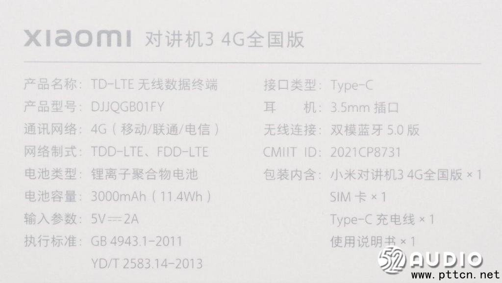 產品參數(shù)信息一覽,產品名稱:TD-LTE 無線數(shù)據(jù)終端,產品型號:DJJQGB01FY,通訊網絡:4G(移動/聯(lián)通/電信 ),網絡制式:TDD-LTE、FDD-LTE,電池類型:鋰離子聚合物電池,電池容量:3000mAh (11.4Wh),輸入?yún)?shù):5V-2A,接口類型:Type-C,耳機:3.5mm插口,無線連接:雙模藍牙5.0版;包裝內含:小米對講機3 4G全國版、SIM卡、Type-C充電線和使用說明書。
