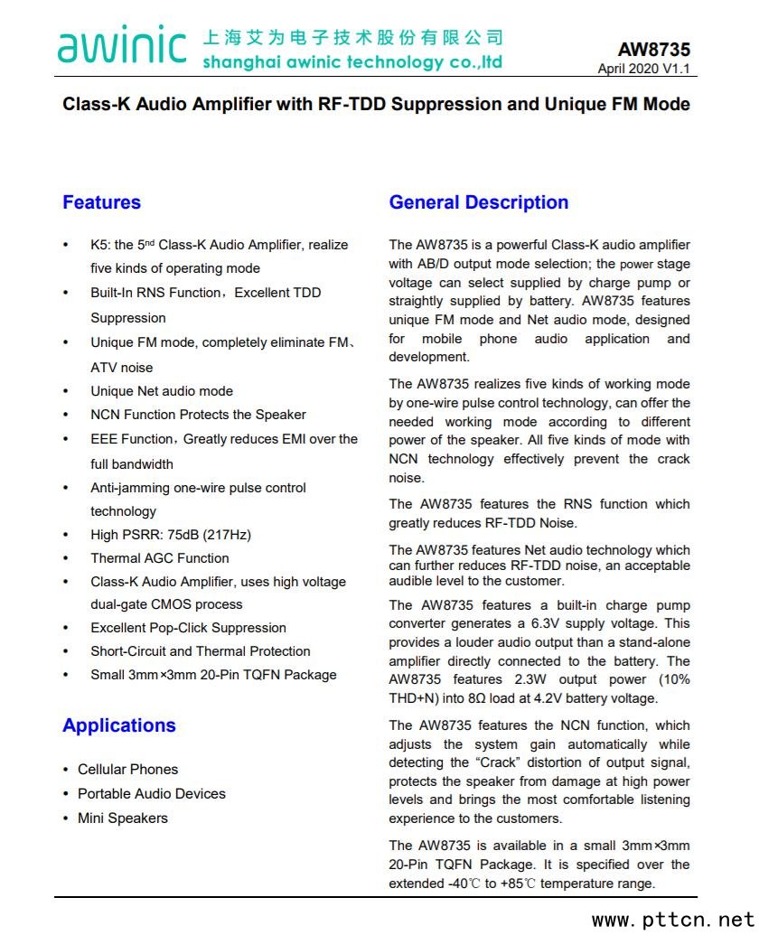 上海艾為電子AW8735 K類音頻功率放大器,可選擇AB/D輸出模式,功率級電壓可以選擇由電荷泵供電或由電池直接供電。AW8735具有獨特的調頻模式和網絡音頻模式,專為手機音頻應用和開發(fā)而設計。