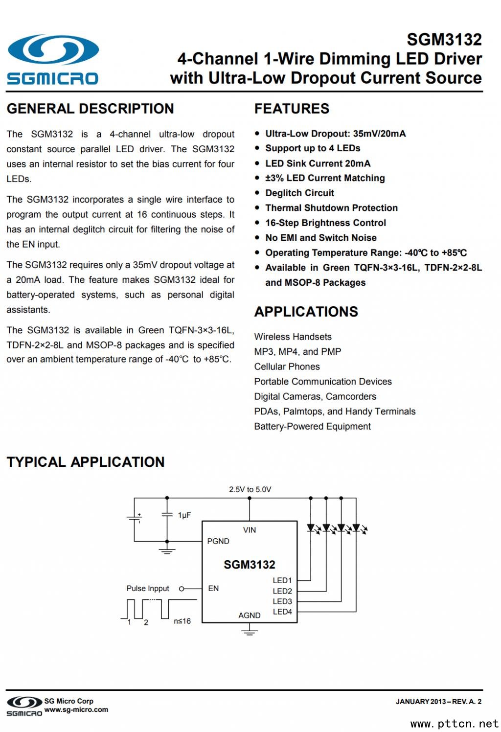 SGMICRO圣邦微SGM3132四通道單線LED調光芯片,用于屏幕背光調節(jié),具備16級亮度調節(jié)和超低壓降。