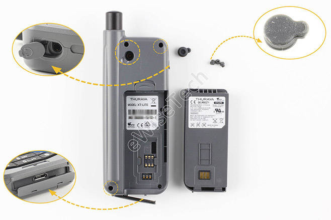 拆解步驟如同上周拆解的衛(wèi)星手機一樣,歐星XT1100也是采用可拆卸電池,電池型號為XTL2680,背面有Thuraya衛(wèi)星通信公司logo。手機背部的三個角分別設(shè)有為螺絲,并且在螺絲安裝孔上都設(shè)有防水硅膠蓋,在手機背部預(yù)留外接天線RF接口處、側(cè)面的耳機孔和底部充電接口也是一樣配有防水硅膠蓋。