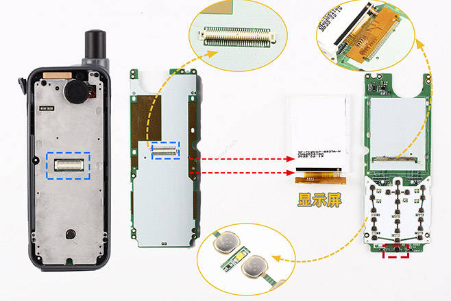 下層主板正反兩面都用十字螺絲固定了散熱板,伸縮式衛(wèi)星天線用射頻同軸線連接下層主板。 在主板頂部配有GPS/北斗衛(wèi)星信號接收天線,與主板之間采用插針式連接。采用雙面膠貼合固定在散熱板上。天線模塊采用陶瓷天線技術(shù),由AMOTECH提供。手機采用圓形揚聲器作為聽筒,用泡棉膠固定,與主板之間采用焊接工藝連接。在電池連接口外圍配有1圈泡棉。