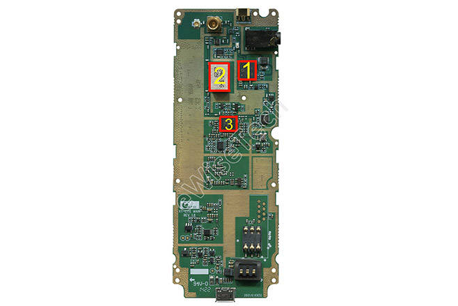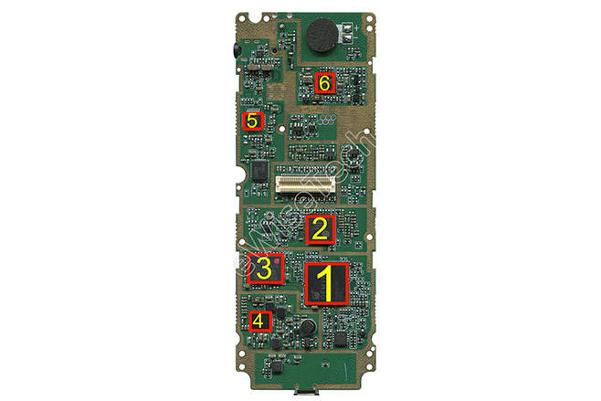 手機內(nèi)部為上下堆疊雙板結(jié)構(gòu),兩層板之間通過BTB板對板連接器連接。上層板為單層PCB板,PCB板背面除連接口外沒有其他部件,PCB板正面為2.4寸TFT顯示屏和實體按鍵區(qū),按鍵區(qū)配有12顆LED背光燈珠。顯示屏與上層PCB板之間采用焊接工藝鏈接,顯示屏背面用雙面膠貼合在PCB板正面。下方有1枚駐極體麥克風(fēng),表面貼有1層泡棉。