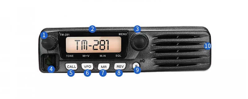 1.電源開關(guān)/音量旋鈕 2.液晶顯示屏 3.MENU按鈕/調(diào)頻控制旋鈕 4.話咪/數(shù)據(jù)接口 5.CALL按鍵 6.VFO按鍵 7.MR按鍵 8.REV按鍵 9.鍵盤鎖/第二功能按鍵