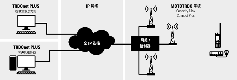 架構(gòu) 1:對于IP Site Connect、Capacity Plus、Linked Capacity Plus系統(tǒng),直接連接中繼臺。
