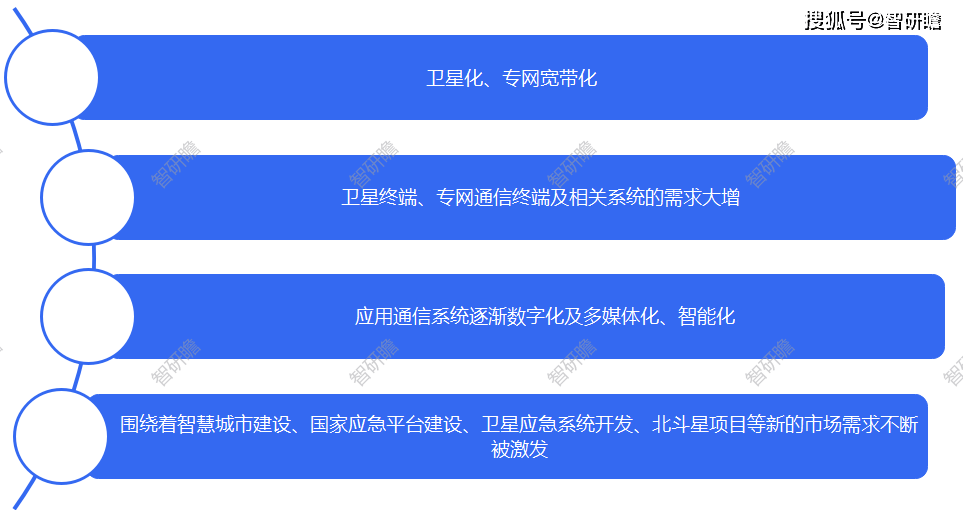 資料來源:智研瞻 企業(yè)迎新機遇 借鑒海外應(yīng)急通信體系的成功經(jīng)驗與實踐,再結(jié)合我國衛(wèi)星互聯(lián)網(wǎng)、專網(wǎng)通信等產(chǎn)業(yè)的飛速發(fā)展與日益成熟,我國應(yīng)急通信行業(yè)的通信手段正逐步向衛(wèi)星化、專網(wǎng)寬帶化方向邁進,這無疑會催生出衛(wèi)星終端設(shè)備、專網(wǎng)通信設(shè)備以及與其配套的系統(tǒng)設(shè)備的巨大需求。 伴隨著大數(shù)據(jù)、云計算、人工智能等尖端科技的日臻完善,應(yīng)用于通信系統(tǒng)中的數(shù)字技術(shù)、多媒體技術(shù)以及智能化技術(shù)也在不斷地推陳出新,相應(yīng)的指揮調(diào)度系統(tǒng)以及信息展示系統(tǒng)也亟待進行升級換代以適應(yīng)新的技術(shù)環(huán)境。 隨著時間推移,信息科技的創(chuàng)新步伐正日益加速,在這個新興領(lǐng)域中涌現(xiàn)出了眾多新穎且頗具競爭力的產(chǎn)品、服務(wù)及商業(yè)形態(tài)。得益于物聯(lián)網(wǎng)、大數(shù)據(jù)、云計算、移動互聯(lián)網(wǎng)等新一代信息技術(shù)以及5G技術(shù)的飛速發(fā)展與廣泛應(yīng)用,社會各個領(lǐng)域的信息化水平也將得到持續(xù)而顯著的提升。 在此背景之下,圍繞著衛(wèi)星應(yīng)急系統(tǒng)開發(fā)、國家應(yīng)急平臺建設(shè)、智慧城市建設(shè)、北斗星項目等諸多新興市場需求將會源源不斷地被激發(fā)出來,這無疑為我國的應(yīng)急通信企業(yè)提供了全新的市場機遇和發(fā)展動力。 圖表:中國應(yīng)急通信發(fā)展趨勢