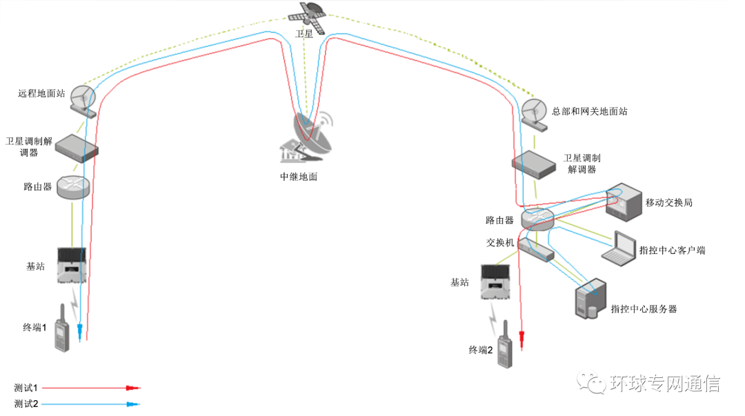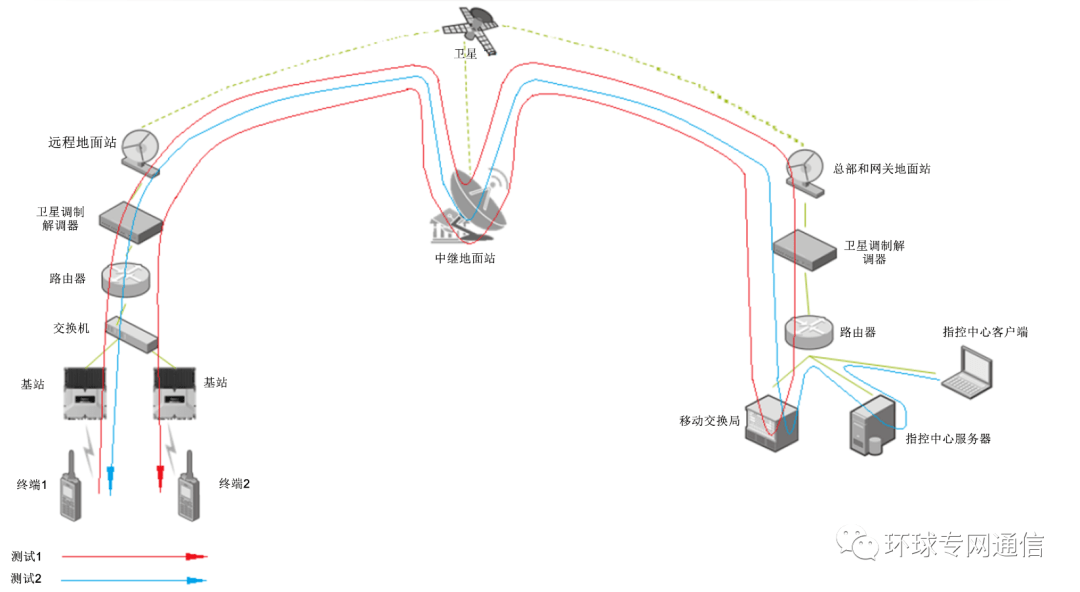 表2:應(yīng)用數(shù)據(jù)速率 每個(gè)地面站的流量需求是根據(jù)所需的每種應(yīng)用的數(shù)量估算的。大型地面站收發(fā)數(shù)據(jù)的能力更高,通常為流量需求更大的區(qū)域(例如本地指揮中心)服務(wù)。估算好地面站的流量需求后,就可以執(zhí)行鏈路預(yù)算分析來(lái)確定所需的衛(wèi)星帶寬。 如果實(shí)際流量需求大于分配給網(wǎng)絡(luò)的衛(wèi)星帶寬的容量,則可能會(huì)導(dǎo)致時(shí)延增加、抖動(dòng)甚至數(shù)據(jù)丟失。應(yīng)該考慮不同的網(wǎng)絡(luò)部署以?xún)?yōu)化帶寬的使用。例如,可以考慮將EMS、GIS服務(wù)器部署于遠(yuǎn)程站點(diǎn)而不是總部,這樣可以減少必須通過(guò)衛(wèi)星的流量。可以使用網(wǎng)絡(luò)QoS對(duì)流量進(jìn)行優(yōu)先級(jí)排序,確保優(yōu)先流量始終得到傳輸。 ▏鏈路質(zhì)量 與大多數(shù)地面回程鏈路相比,衛(wèi)星鏈路環(huán)境相對(duì)不穩(wěn)定。 距離太遠(yuǎn)意味著巨大的傳輸損耗。雨衰、大氣閃爍和環(huán)境噪聲意味著衛(wèi)星鏈路的誤碼率(BER)低于地面鏈路。但是通過(guò)合理的設(shè)計(jì)可以克服這一點(diǎn),包括遠(yuǎn)端站設(shè)備的選型、上行鏈路功率控制(UPC)、自適應(yīng)調(diào)制編碼(ACM)、調(diào)制、前向糾錯(cuò)(FEC)編碼以及使用設(shè)計(jì)余量。盡管存在這些挑戰(zhàn),準(zhǔn)無(wú)誤碼(QEF)鏈路仍然能夠建立。 如何應(yīng)對(duì)挑戰(zhàn) ▏服務(wù)質(zhì)量(QoS) QoS對(duì)于確保不同流量類(lèi)型和應(yīng)用的無(wú)縫融合至關(guān)重要。 QoS算法可以由衛(wèi)星通信調(diào)制解調(diào)器或連接到調(diào)制解調(diào)器的IP路由器執(zhí)行。可以將不同的QoS優(yōu)先級(jí)應(yīng)用于各種流量類(lèi)型、甚至應(yīng)用在遠(yuǎn)程應(yīng)用終端上,從而確保優(yōu)先處理優(yōu)先級(jí)最高的流量。優(yōu)先級(jí)可以定義,但通常語(yǔ)音和實(shí)時(shí)應(yīng)用的優(yōu)先級(jí)最高。 ▏服務(wù)等級(jí)協(xié)議(SLA) 在專(zhuān)線鏈路場(chǎng)景,所有衛(wèi)星帶寬均可供遠(yuǎn)程用戶(hù)使用,并且QoS用于確定優(yōu)先級(jí)。在共享帶寬場(chǎng)景,可能有很多遠(yuǎn)程用戶(hù)。 衛(wèi)星通信網(wǎng)絡(luò)設(shè)計(jì)對(duì)于每個(gè)遠(yuǎn)程用戶(hù)都有關(guān)于承諾信息速率(CIR)和最大信息速率(MIR)的默認(rèn)SLA。CIR和MIR可以調(diào)整,以確保需要帶寬的遠(yuǎn)端站可以使用更多帶寬。 ▏TCP加速 TCP/IP流量并不能很好地處理時(shí)延。 如果沒(méi)有優(yōu)化技術(shù),在衛(wèi)星回程上,TCP/IP將被限制為大約1000kbps。TCP加速是用于提高衛(wèi)星通信效率和服務(wù)質(zhì)量的各種機(jī)制的總稱(chēng),例如選擇性否定確認(rèn)(SNACK)、TCP窗口擴(kuò)展和流量控制。SNACK可以識(shí)別特定的丟失或損壞的數(shù)據(jù)包,然后僅重新發(fā)送這些數(shù)據(jù)包,從而快速恢復(fù)傳輸并更好地利用衛(wèi)星帶寬。TCP加速支持窗口擴(kuò)展,窗口尺寸遠(yuǎn)遠(yuǎn)超過(guò)標(biāo)準(zhǔn)TCP窗口64字節(jié)的限制。TCP擁塞避免和控制機(jī)制使用公平共享和合理緩沖區(qū)間大小的動(dòng)態(tài)調(diào)整管理避免不必要的數(shù)據(jù)包重傳。 ▏帶寬壓縮 可以使用流量壓縮設(shè)備來(lái)壓縮TCP/IP報(bào)包頭和載荷。這些技術(shù)是無(wú)損的,因此不會(huì)丟失任何數(shù)據(jù)。 帶寬壓縮可以大大減少流量需求。 使用衛(wèi)星鏈路進(jìn)行專(zhuān)網(wǎng)通信測(cè)試 經(jīng)過(guò)實(shí)測(cè)證明衛(wèi)星鏈路相關(guān)的典型時(shí)延和抖動(dòng)不會(huì)造成呼叫建立、操作和音頻質(zhì)量方面的問(wèn)題。 用于測(cè)試有時(shí)延的語(yǔ)音質(zhì)量的測(cè)試平臺(tái)包括以下設(shè)定和條件: 1) 星狀拓?fù)?/span> 2) 基于TDMA方式 3) 對(duì)講機(jī)終端位于遠(yuǎn)端站 4) 通過(guò)比較錄音確定音頻質(zhì)量 測(cè)試1:從遠(yuǎn)端集群對(duì)講機(jī)到另一遠(yuǎn)端集群對(duì)講機(jī) 圖2顯示了此測(cè)試的設(shè)備配置和流量走向,測(cè)試在一個(gè)基站上的警用數(shù)字集群(PDT)終端與另一個(gè)基站上的PDT終端之間進(jìn)行。為了方便,兩個(gè)PDT終端位于同一個(gè)衛(wèi)星遠(yuǎn)端站上,但是流量走向和時(shí)延卻相同,模擬這兩臺(tái)終端分別位于各自的衛(wèi)星遠(yuǎn)端站上。流量從終端1通過(guò)衛(wèi)星傳送到衛(wèi)星關(guān)口站上的移動(dòng)交換中心(MSO),然后通過(guò)衛(wèi)星傳回PDT終端2。流量經(jīng)過(guò)四跳衛(wèi)星鏈路。測(cè)試表明,收發(fā)終端上的音頻沒(méi)有明顯區(qū)別。表3匯總了測(cè)試和結(jié)果。所有時(shí)延都是近似值,包括了呼叫建立以及通過(guò)調(diào)制解調(diào)器、路由器和其他設(shè)備的延遲。