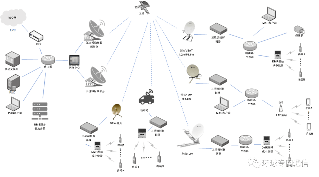 衛(wèi)星通信地面站利用通信衛(wèi)星作為中繼,不僅可以把有線網(wǎng)的功能延伸到野外,同時(shí)可以為事發(fā)現(xiàn)場(chǎng)的專(zhuān)網(wǎng)通信提供遠(yuǎn)程跨地域傳輸路由,實(shí)現(xiàn)語(yǔ)音、數(shù)據(jù)、圖像的中轉(zhuǎn)和傳輸功能,保障全時(shí)、全域和全天候通信暢通。 簡(jiǎn)介 基于PDT、TETRA、LTE和Mesh融合的無(wú)線通信對(duì)于應(yīng)急和遠(yuǎn)程作業(yè)至關(guān)重要。通常,返回指揮中心、調(diào)度中心或總部的通信鏈路由中轉(zhuǎn)臺(tái)或地面基站完成回傳。 當(dāng)終端距離太遠(yuǎn)超出視線范圍或地面鏈路不存在或已損壞時(shí), 衛(wèi)星通信可以在終端和指揮中心之間提供鏈接。衛(wèi)星通信還可以支持由于特殊情況(例如自然災(zāi)害)而臨時(shí)增加容量的需求。 傳統(tǒng)的專(zhuān)網(wǎng)(PMR)使用窄帶,主要傳送語(yǔ)音和短消息。然而,使用包括視頻在內(nèi)的寬帶通信正變得日趨必要。使用LTE和Mesh通信,甚至可連執(zhí)法記錄儀和無(wú)人機(jī)。通過(guò)寬帶通信還可以共享大流量數(shù)據(jù),包括地圖、建筑示意圖等。同時(shí)衛(wèi)星通信可以支持基于IP的任何業(yè)務(wù)。 衛(wèi)星通信的 挑戰(zhàn)在于對(duì)時(shí)延、抖動(dòng)、鏈路質(zhì)量(誤碼率和可用度)、擁塞和遠(yuǎn)程網(wǎng)絡(luò)的管理。時(shí)延是由地球表面與衛(wèi)星之間的距離而導(dǎo)致的。與光纖等地面鏈路相比,衛(wèi)星鏈路更容易出錯(cuò),并且更容易受到雨衰的影響。抖動(dòng)可能由基帶傳輸格式(例如TCP/IP幀)、加密和衛(wèi)星接入方式(TDMA與SCPC)引入。 合理設(shè)計(jì)的衛(wèi)星鏈路可提供足夠的容量以減少網(wǎng)絡(luò)擁塞,保證足夠的雨衰余量,從而實(shí)現(xiàn)基本無(wú)差錯(cuò)通信。測(cè)試表明,衛(wèi)星鏈路時(shí)延問(wèn)題不足以影響語(yǔ)音質(zhì)量。 衛(wèi)星帶寬租用費(fèi)用相對(duì)高昂,需要權(quán)衡容量和成本。通過(guò)網(wǎng)絡(luò)規(guī)劃,包括QoS算法,可使通過(guò)衛(wèi)星鏈路的流量最小化,進(jìn)而可通過(guò)減小鏈路通道來(lái)最大程度地降低成本。部署本地指揮與控制調(diào)度系統(tǒng)有助于確保本地流量留在本地,只有必須流向總部或主要指揮中心的流量才會(huì)通過(guò)衛(wèi)星鏈路。適當(dāng)?shù)腝oS算法和合理設(shè)計(jì)的衛(wèi)星接入方式可最大程度地減少抖動(dòng)。 衛(wèi)星通信可以作為主要鏈路為遠(yuǎn)程無(wú)線網(wǎng)絡(luò)提供安全而穩(wěn)定的回程,在有額外容量需求或地面回程損壞時(shí)作為臨時(shí)解決方案。 在應(yīng)急災(zāi)害現(xiàn)場(chǎng)或遠(yuǎn)程營(yíng)地/設(shè)施中,衛(wèi)星通信也可以是無(wú)線網(wǎng)絡(luò)的組成部分。衛(wèi)星通信設(shè)備非常靈活,其大小型固定站、便攜站、車(chē)載靜中通或動(dòng)中通終端可作用于海事、陸地或航空等應(yīng)用場(chǎng)景。 基于衛(wèi)星的專(zhuān)網(wǎng)通信場(chǎng)景 在臨時(shí)使用陸地通信業(yè)務(wù)或者在無(wú)法使用標(biāo)準(zhǔn)地面網(wǎng)絡(luò)系統(tǒng)的邊遠(yuǎn)地區(qū),通過(guò)衛(wèi)星傳輸?shù)臒o(wú)線通信是連接的唯一選擇。圖1顯示了典型的衛(wèi)星專(zhuān)網(wǎng)通信組網(wǎng)。