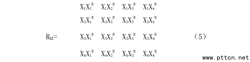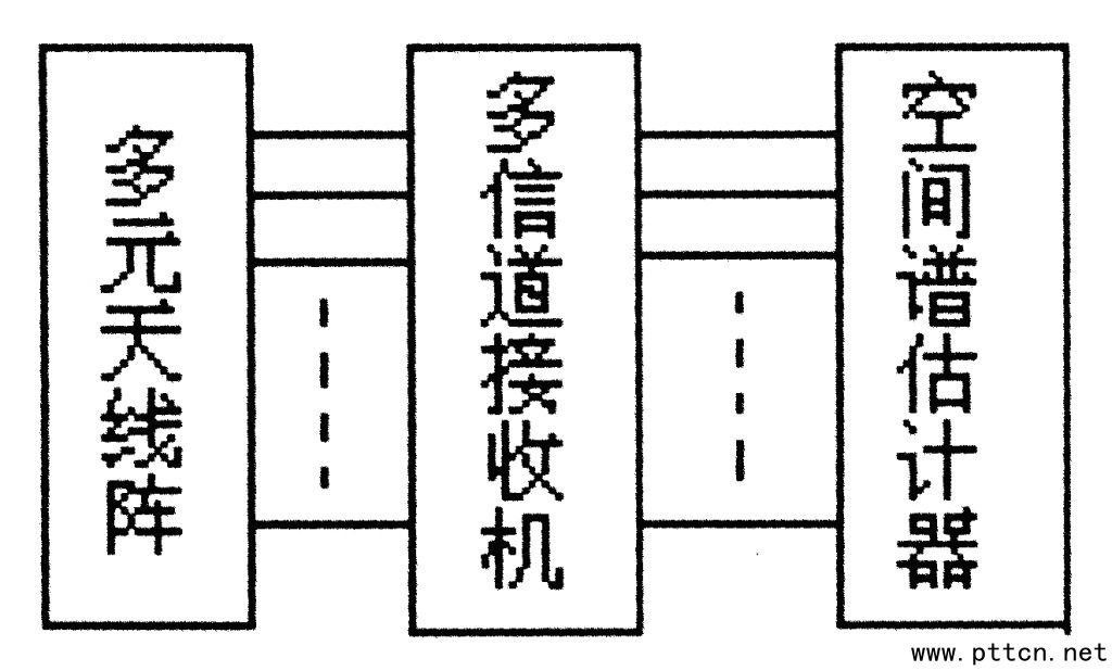 圖12到達(dá)時(shí)間差測向 原理框圖 到達(dá)時(shí)間差測向體制的特點(diǎn):測向準(zhǔn)確度高,靈敏度高,測向速度快,極化誤差不敏感,沒有間距誤差,測向場地環(huán)境要求低。但是抗干擾性能不好,載波必須有確定的調(diào)制,目前應(yīng)用尚不普及。 七、空間譜估計(jì)測向體制 空間譜估計(jì)測向體制的測向原理:在已知座標(biāo)的多元天線陣中,測量單元或多元電波場的來波參數(shù),經(jīng)過多信道接收機(jī)變頻、放大,得到矢量信號(hào),將其采樣量化為數(shù)字信號(hào)陣列,送給空間譜估計(jì)器,運(yùn)用確定的算法求出各個(gè)電波的來波方向、仰角、極化等參數(shù)。 空間譜估計(jì)測向原理方框圖見圖(13)。 以四元天線陣為例,空間譜估計(jì)測向的基本公式,如公式(5)所示。空間譜估計(jì)測向是把每個(gè)天線的接收信號(hào),與其他各個(gè)天線的信號(hào)都進(jìn)行比較,這就是相關(guān)矩陣法,即協(xié)方差矩陣法,它完整地反映了空間電磁場的實(shí)際情況。具體地說就是構(gòu)成如下的協(xié)方差矩陣: