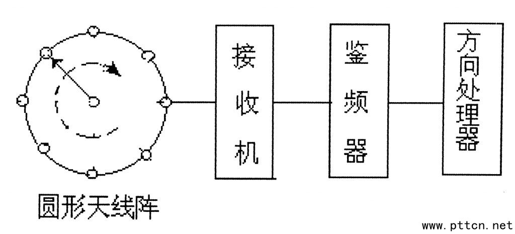 圖(9)干涉儀測向原理框圖 相關(guān)干涉儀測向,是干涉儀測向的一種,它的測向原理是:在測向天線陣列工作頻率范圍內(nèi)和360度方向上,各按一定規(guī)律設(shè)點(diǎn),同時(shí)在頻率間隔和方位間隔上,建立樣本群,在測向時(shí),將所測得的數(shù)據(jù)與樣本群進(jìn)行相關(guān)運(yùn)算和插值處理,以獲得來波信號(hào)方向。轉(zhuǎn)載請(qǐng)注明來自科創(chuàng)儀表局 干涉儀測向體制的特點(diǎn):采用變基線技術(shù),可以使用中、大基礎(chǔ)天線陣,采用多信道接收機(jī)、計(jì)算機(jī)和FFT技術(shù),使得該體制測向靈敏度高,測向準(zhǔn)確度高,測向速度快,可測仰角,有一定的抗波前失真能力。該體制極化誤差不敏感。干涉儀測向是當(dāng)代比較好的測向體制,由于研制技術(shù)較復(fù)雜、難度較大,因此造價(jià)較高。干涉儀測向?qū)邮招盘?hào)的幅度不敏感,測向天線在空間的分布和天線的架設(shè)間距,比幅度比較式測向靈活,但又必須遵循某種規(guī)則。例如:可以是三角形,也可以是五邊形,還可以是L形等。 四、多普勒測向體制 多普勒測向體制的測向原理:依據(jù)電波在傳播中,遇到與它相對(duì)運(yùn)動(dòng)的測向天線時(shí),被接收的電波信號(hào)產(chǎn)生多普勒效應(yīng),測定多普勒效應(yīng)產(chǎn)生的頻移,可以確定來波的方向。 為了得到多普勒效應(yīng)產(chǎn)生的頻移,必須使測向天線與被測電波之間做相對(duì)運(yùn)動(dòng),通常是以測向天線在接收?qǐng)鲋校宰銐蚋叩乃俣冗\(yùn)動(dòng)來實(shí)現(xiàn)的,當(dāng)測向天線完全朝著來波方向運(yùn)動(dòng)時(shí),多普勒效應(yīng)頻移量(升高)最大。多普勒測向的基本公式如公式(3)所示。 當(dāng)測向天線做圓周運(yùn)動(dòng)時(shí),會(huì)使來波信號(hào)的相位受到正弦調(diào)制。設(shè):以天線場中心0點(diǎn)為相位參考點(diǎn),信號(hào)的相位為Φ,天線接收信瞬時(shí)相位為Φ(t),于是有:Φt=ωt+Φ+kcCos(Ωt-θ) 式中:ω為信號(hào)角頻率,Ω為天線旋轉(zhuǎn)角頻率,θ為來波方向角度,相位常數(shù)kc=2πr/λ,其中r為天線間距,λ為信號(hào)波長。 這時(shí)測向天線所收到信號(hào)Ut的表達(dá)式為:Ut=Acos[ωt+Φ+kcCos(Ωt-θ)] 多普勒效應(yīng)使測向天線接收到的信號(hào)產(chǎn)生調(diào)相,多普勒相移為ΦD,于是有:ΦD=kcCos(Ωt-θ) 相應(yīng)的多普勒頻移為:f=dΦD/dt=-kcSin(Ωt-θ) (3) 多普勒頻移f,可以從旋轉(zhuǎn)的測向天線接收到的信號(hào),經(jīng)過接收機(jī)變頻、放大、鑒頻以后得到。多普勒頻移f與0點(diǎn)參考頻率相比較,即可得到來波方向角θ。 多普勒測向,通常不是直接旋轉(zhuǎn)測向天線,因?yàn)檫@在工程上難于實(shí)現(xiàn),它是將多郭天線架設(shè)在同心圓的圓周上,電子開關(guān)順序快速接通各個(gè)天線,等效于旋轉(zhuǎn)測向天線。人們稱這種測向機(jī)為準(zhǔn)多普勒測向機(jī)。準(zhǔn)多普勒測向原理方框圖如圖(10)所示。