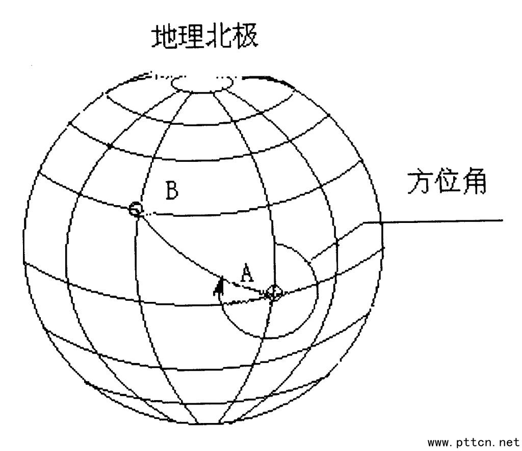 無線電測向系統(tǒng)的組成,如圖(2)所示。通常包括測向天線、輸入匹配單元、接收機(jī)和方位信息處理顯示四個(gè)部分。測向天線是電磁場能量的探測器、傳感器,又是能量轉(zhuǎn)換器,它把空中傳播的電磁波能量感應(yīng)接收下來,連同幅度、相位、到達(dá)時(shí)間等信息轉(zhuǎn)換為交流電信號(hào),饋送給接收機(jī);輸入匹配單元實(shí)現(xiàn)天線至接收機(jī)的匹配傳輸和必要的變換;接收機(jī)的作用是選頻、下變頻、無失真放大和信號(hào)解調(diào);檢測、比較、計(jì)算、處理、顯示(指示)方位信息,是第四部分的任務(wù)。 無線電測向以測向機(jī)所在地,以及過地理北極的子午線為參考零度方向。兩點(diǎn)之間方位度數(shù)按下述方法確定:假設(shè)地球表面A、B兩點(diǎn),A點(diǎn)為測向機(jī)所在地,基準(zhǔn)方向與方位角如圖(3)所示。量判B點(diǎn)相對(duì)于A點(diǎn)的方位角,是從過A點(diǎn)的子午線(零度)順時(shí)針旋轉(zhuǎn)到A至B的大圓路連線的度數(shù)。B點(diǎn)相對(duì)于A點(diǎn)的方位角度數(shù)具有唯一性