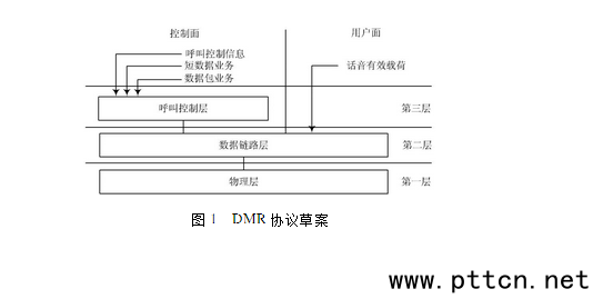 DMR協(xié)議結(jié)構(gòu)遵守一種普通的分層結(jié)構(gòu),定義了 一種模型草案,把模型分成三層,如圖1所示。