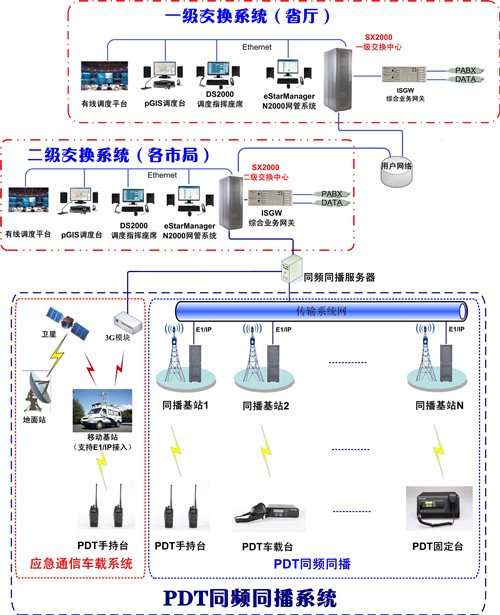 主頁(yè)(http://www.www.jjxinkai.com):東方通信:公安行業(yè)整體解決方案---PDT篇(3) ◆ SX2000交換子系統(tǒng); ◆ Netmanager Nstar2000網(wǎng)管子系統(tǒng); ◆ DS2000調(diào)度子系統(tǒng)。 交換中心、網(wǎng)管系統(tǒng)、調(diào)度中心設(shè)置在用戶的交換控制中心,彼此通過(guò)Ethernet連接;各基站通過(guò)E1/IP傳輸鏈路與交換中心互聯(lián);固定臺(tái)、車(chē)載臺(tái)和手持臺(tái)沿基站無(wú)線覆蓋射頻信號(hào)通過(guò)空中接口登錄到基站后接入到PDT系統(tǒng)中,構(gòu)成一個(gè)具備完善調(diào)度指揮功能的鏈狀數(shù)字無(wú)線集群系統(tǒng)。 解決之道二 PDT同頻同播系統(tǒng)