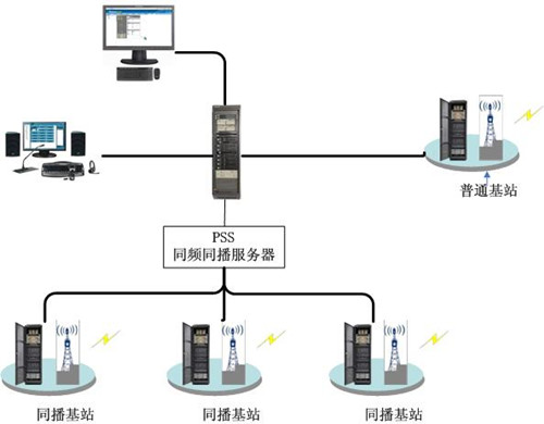 圖2 PDT數(shù)字集群同頻同播系統(tǒng)組網(wǎng)架構(gòu)示意圖 同頻同播系統(tǒng)是建立多個(gè)同播基站,并利用鏈路將這些基站連接起來(lái),每個(gè)基站負(fù)責(zé)一定范圍的覆蓋,這樣利用多個(gè)同頻基站和鏈路連接就可以完成大區(qū)域的同播覆蓋,從而加大無(wú)線對(duì)講網(wǎng)的覆蓋范圍,提高覆蓋區(qū)的通信質(zhì)量。