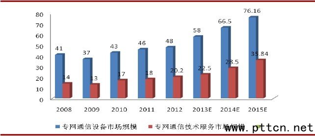 近年來(lái)隨著工業(yè)化與信息化的融合不斷加快,加上我國(guó)政府公共安全投資不斷增加,專網(wǎng)通信市場(chǎng)規(guī)模近年來(lái)不斷擴(kuò)大,2011年已達(dá)64億元,2012年達(dá)到68.2億元。預(yù)計(jì)13年到15年市場(chǎng)規(guī)模會(huì)有20%的增長(zhǎng)。