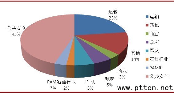 據(jù)IMS research統(tǒng)計(jì),2008年全球?qū)>W(wǎng)通信行業(yè)市場(chǎng)規(guī)模約為690億元;2009年行業(yè)受到金融危機(jī)影響市場(chǎng)規(guī)模縮小約為620億元;2010年隨著全球經(jīng)濟(jì)好轉(zhuǎn),專網(wǎng)通信行業(yè)市場(chǎng)規(guī)模擴(kuò)大,約為660億元,預(yù)計(jì)到2013年將增長(zhǎng)到830億元人民幣,年復(fù)合增長(zhǎng)率7.4%,其中,數(shù)字產(chǎn)品市場(chǎng)復(fù)合增長(zhǎng)率為20%。其中歐美等發(fā)達(dá)國(guó)家發(fā)展規(guī)模較大。例如德國(guó)、英國(guó)、瑞典等國(guó)家都擁有TETRA、GSM-R等全國(guó)性的無(wú)線專網(wǎng),專網(wǎng)用戶上百萬(wàn),在有些國(guó)家專網(wǎng)用戶甚至達(dá)到人口總數(shù)的80%,大型企業(yè)如沃爾瑪,福特等都有發(fā)達(dá)的信息化專網(wǎng),但是占比最大的還是公共安全領(lǐng)域用戶(45%)以及運(yùn)輸業(yè)用戶(23%)。