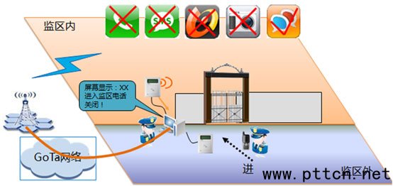 采用監(jiān)管區(qū)的無線信號屏蔽方案限制語音功能,投資成本高,實施難度大。如果監(jiān)獄在市區(qū)附近,還影響監(jiān)獄周邊用戶使用語音功能。GoTa系統(tǒng)可以通過無線,遠程對GoTa終端進行精確控制,如控制終端普通語音、短信、數(shù)據(jù)業(yè)務(wù)、攝像頭等的開啟和關(guān)閉。該功能和門禁系統(tǒng)融合,用于在某一特殊區(qū)域控制終端可用的功能,比如在監(jiān)管區(qū)中,需要將獄警終端的語音、短信、數(shù)據(jù)等業(yè)務(wù)全部關(guān)閉,只留下集群業(yè)務(wù)。