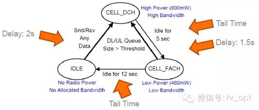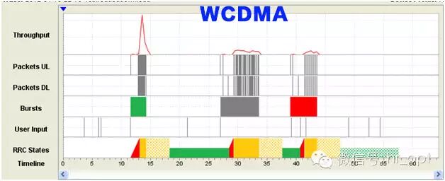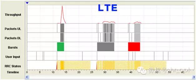 手機傳送數(shù)據(jù)時處于連續(xù)接收(Continuous Reception)狀態(tài),如果手機停止數(shù)據(jù)傳送(定時器終止)而進入等待數(shù)據(jù)傳送,此時,由連續(xù)接收狀態(tài)轉(zhuǎn)移至short DRX 和 long DRX 。 手機處于連續(xù)接收狀態(tài),表明手機正在傳送數(shù)據(jù)。當(dāng)數(shù)據(jù)傳送完成,手機轉(zhuǎn)移至short DRX,等待傳送數(shù)據(jù),此時,如果還有后續(xù)數(shù)據(jù)要傳,手機將返回連續(xù)接收狀態(tài)。如果沒有后續(xù)數(shù)據(jù)再傳,手機將進一步轉(zhuǎn)移至long DRX。 手機處于long DRX,就意味著準(zhǔn)備進入RRC_IDLE狀態(tài),如果此時還有后續(xù)數(shù)據(jù)要傳,同樣也會返回到連續(xù)接收狀態(tài);如果沒有,手機將轉(zhuǎn)移至RRC_IDLE狀態(tài)。 無論是連續(xù)接收狀態(tài),還是short DRX、long DRX,都需要去監(jiān)聽是否有數(shù)據(jù)傳輸,此時手機發(fā)射功率較高。 當(dāng)手機進入RRC_IDLE狀態(tài),手機發(fā)射功率非常低,使用小于15毫瓦功率。 LTE和WCDMA兩種不同的RRC狀態(tài)機對手機耗電有什么影響? 實驗證明,LTE網(wǎng)絡(luò)下,手機在連續(xù)接收狀態(tài)下消耗的電量的大小取決于手機上網(wǎng)速率的高低,速率越低,消耗的電量越低,速率越高,消耗的電量越高。 而在WCDMA網(wǎng)絡(luò)下,手機處于CELL_DCH狀態(tài)時,無論速率大小,手機耗電量不變。 不過,4G手機的耗電量略比3G手機高,主要原因不在數(shù)據(jù)傳送時,而是在數(shù)據(jù)傳送結(jié)束后的那段等待時間。 在LTE Short DRX 和 Long DRX監(jiān)聽狀態(tài)下,雖然沒有數(shù)據(jù)傳送,但此時手機仍然保持較高功率發(fā)射;而在WCDMA CELL_FACH狀態(tài)下,手機發(fā)射功率將減半。 為了清楚的描述LTE 和 WCDMA狀態(tài)機運行差異對手機耗電的影響,來自AT&T實驗室給出了兩張診斷對比圖。