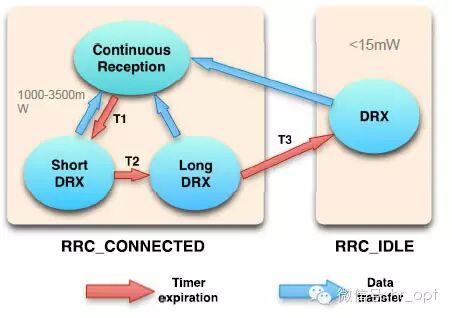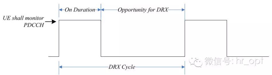 我們IDLE狀態(tài)開始,順時針方向來分析上圖。 1. IDLE狀態(tài)下,手機關(guān)閉無線發(fā)射。當(dāng)開始傳送數(shù)據(jù)時,手機會開啟無線發(fā)射,手機狀態(tài)從IDLE轉(zhuǎn)移到CELL_DCH狀態(tài),這一狀態(tài)轉(zhuǎn)移有2s時延。 2. 手機處于CELL_DCH狀態(tài)時,表示手機正在傳送或接收數(shù)據(jù)。當(dāng)數(shù)據(jù)傳送結(jié)束,手機會保留CELL_DCH狀態(tài)5秒,以備還有后續(xù)數(shù)據(jù)要傳。這個5秒鐘的空閑時間我們稱之為DCH tail。 3. 假如5秒內(nèi)沒有續(xù)傳數(shù)據(jù),手機會轉(zhuǎn)移至共享信道FACH,這叫CELL_FACH狀態(tài)。CELL_FACH狀態(tài)下,手機只傳送信令或少量數(shù)據(jù),如果有更多數(shù)據(jù)內(nèi)容需要傳送,手機會重新轉(zhuǎn)移至CELL_DCH狀態(tài)。 4. 在進入CELL_FACH狀態(tài)12秒后,如果沒有數(shù)據(jù)傳送,手機將轉(zhuǎn)移至IDLE狀態(tài),關(guān)閉無線發(fā)射。 現(xiàn)在,我們來看一看LTE狀態(tài)機運行情況。 LTE RRC狀態(tài)與手機耗電的關(guān)系 LTE的RRC狀態(tài)相對簡化,只有兩種:RRC_IDLE和RRC_CONNECTED。 基于包的數(shù)據(jù)流通常是突發(fā)性的,在沒有數(shù)據(jù)傳輸?shù)臅r候,可以通過關(guān)閉UE的接收電路來降低功耗,從而提升電池使用時間,為此,LTE采用DRX(Discontinuous Reception,不連續(xù)接收)技術(shù)。 DRX的基本機制是為UE配置一個DRX cycle。DRX cycle由“On Duration”和“Opportunity for DRX”組成:在“On Duration”的時間內(nèi),UE監(jiān)聽并接收PDCCH(激活期);在“Opportunity for DRX”時間內(nèi),UE不接收下行信道的數(shù)據(jù)以節(jié)省功耗(休眠期)。