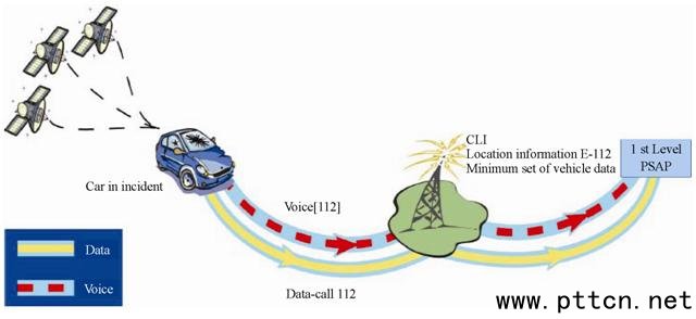 圖1 車載應(yīng)急通信系統(tǒng)(來自www.heero-piot.et) 2 車載應(yīng)急通信技術(shù)及標(biāo)準(zhǔn)現(xiàn)狀 2.1 技術(shù)發(fā)展背景 車載應(yīng)急通信系統(tǒng)的技術(shù)近年在歐洲和俄羅斯發(fā)展迅速。早在2005年歐盟委員會(European Commission)提出建立車載緊急呼叫業(yè)務(wù)eCall的需求,希望在歐洲范圍內(nèi)統(tǒng)一實施部署車載緊急呼叫服務(wù)系統(tǒng)。為了推廣這項重要的道路安全措施,2005年歐盟委員會將技術(shù)標(biāo)準(zhǔn)任務(wù)下達至ETSI/3GPP(ETSI 歐洲電信標(biāo)準(zhǔn)協(xié)會),對eCall技術(shù)通信標(biāo)準(zhǔn)體系進行開發(fā)建設(shè);2008年,ETSI/3GPP開始發(fā)布eCall通信模塊技術(shù)系列標(biāo)準(zhǔn);2011年,歐洲9國共同成立HeERO(泛歐州車車載緊急呼叫業(yè)務(wù))聯(lián)盟,召集各國汽車行業(yè)和通信行業(yè)的公司組織共同加入對eCall的系統(tǒng)性推廣建設(shè),致力于建立一個在歐洲范圍內(nèi)可實現(xiàn)互操作的互聯(lián)互通的車載應(yīng)急通信大系統(tǒng)。HeERO聯(lián)盟的任務(wù)包括對eCall業(yè)務(wù)系統(tǒng)的模式設(shè)計和部署規(guī)劃、技術(shù)標(biāo)準(zhǔn)的起草推動、技術(shù)試驗測試、試商用推廣等。截止到2015年,HeERO已經(jīng)發(fā)展到16個國家范圍和包含車和通信行業(yè)在內(nèi)的43個產(chǎn)業(yè)合作伙伴的加盟。 此外,俄羅斯近年大力發(fā)展車載應(yīng)急通信系統(tǒng),基于俄羅斯的GLONASS定位衛(wèi)星系統(tǒng),提出ERA_GLONASS車載應(yīng)急通信系統(tǒng),其技術(shù)方案與歐洲eCall系統(tǒng)技術(shù)方案類似,也即在發(fā)生嚴(yán)重交通事故后,通過該系統(tǒng)也能夠自動撥叫俄羅斯緊急救援電話,并且報告事故車輛所處的位置和車倆信息,其定位衛(wèi)星技術(shù)明確使用的是俄羅斯的衛(wèi)星定位GLONASS系統(tǒng)。目前,俄羅斯已經(jīng)啟動了對ERA_GLONASS技術(shù)的強制要求。 2.2 技術(shù)原理簡介 車載應(yīng)急通信技術(shù)(eCall技術(shù))的設(shè)計主要包含兩條通信路徑:如圖2所示,一條路徑為通過蜂窩網(wǎng)絡(luò)撥打語音緊急呼叫,這個過程與蜂窩網(wǎng)絡(luò)緊急呼叫的實現(xiàn)原理一致;另一條路徑是通過衛(wèi)星通信系統(tǒng)截取的定位信息,將位置信息及相關(guān)車輛信息打包成規(guī)范化格式的數(shù)據(jù)信息單元通過蜂窩移動網(wǎng)絡(luò)傳送給應(yīng)急業(yè)務(wù)平臺。通過這兩個通信路徑,當(dāng)汽車發(fā)生緊急情況(如碰撞),人為或自動的觸發(fā)應(yīng)急狀態(tài),將終端模塊當(dāng)前的位置信息通過蜂窩網(wǎng)絡(luò)傳送給應(yīng)急業(yè)務(wù)平臺,同時發(fā)起緊急呼叫,聯(lián)絡(luò)到應(yīng)急業(yè)務(wù)平臺,在盡量短時間內(nèi)完成事故上報。