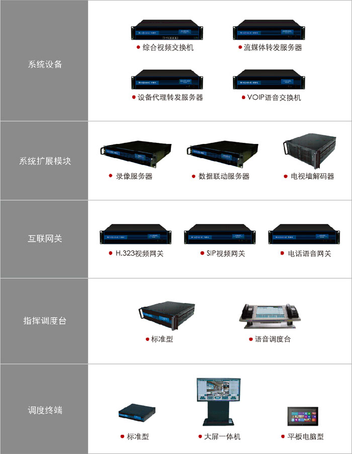 系統(tǒng)平臺(tái) 綜合視頻交換機(jī) 實(shí)現(xiàn)用戶身份認(rèn)證、用戶及設(shè)備的權(quán)限和級別管理、終端地址解析、業(yè)務(wù)功能控制、設(shè)備管理、分級管理、支持單播和組播切換等功能。 可支持升級配置級聯(lián)模塊、雙流會(huì)議模塊、數(shù)據(jù)會(huì)議模塊、電子地圖模塊等,增強(qiáng)綜合視頻交換機(jī)的相應(yīng)能力。 流媒體轉(zhuǎn)發(fā)服務(wù)器 實(shí)現(xiàn)視頻流、音頻流、數(shù)據(jù)流的多路復(fù)用轉(zhuǎn)發(fā),提供高清視頻流轉(zhuǎn)發(fā)機(jī)制,提高帶寬利用率,支持TCP/UDP互轉(zhuǎn)傳輸模式,支持分布部署。 設(shè)備代理接入服務(wù)器 實(shí)現(xiàn)多品牌監(jiān)控設(shè)備代理接入,實(shí)時(shí)巡檢、顯示各種終端設(shè)備狀態(tài)等。支持分布部署,提供高/標(biāo)清視頻的接入,支持高清標(biāo)清的混搭,滿足用戶的接入需求。 系統(tǒng)綜合維護(hù)管理軟件 系統(tǒng)綜合維護(hù)管理軟件支持綜合視頻交換機(jī)管理、電視墻控制、錄像控制管理、報(bào)警管理、雙機(jī)熱備監(jiān)視、編碼器配置的統(tǒng)一管理,并整合部分系統(tǒng)工具,使用戶管理和使用系統(tǒng)更加方便快捷。 系統(tǒng)擴(kuò)展模塊 錄像服務(wù)器軟件:實(shí)現(xiàn)監(jiān)控集中錄像、指揮調(diào)度錄像、雙流錄像、專業(yè)數(shù)據(jù)影像采集錄像等,多種錄像形式,支持對錄像文件進(jìn)行備份、恢復(fù)、刪除、編輯等操作。錄像服務(wù)器支持不間斷錄像、定時(shí)錄像、定點(diǎn)重復(fù)錄像、報(bào)警觸發(fā)錄像等多種錄像方式,支持分布部署,實(shí)現(xiàn)并發(fā)錄像負(fù)載動(dòng)態(tài)均衡,滿足高清標(biāo)清多種視頻圖像不同碼流的存儲(chǔ)優(yōu)化。 數(shù)據(jù)報(bào)警服務(wù)器:主要是連接防盜報(bào)警主機(jī),通過數(shù)據(jù)報(bào)警服務(wù)器實(shí)現(xiàn)各級防盜報(bào)警系統(tǒng)與網(wǎng)絡(luò)視頻監(jiān)控系統(tǒng)聯(lián)動(dòng)報(bào)警的功能。 電視墻解碼器 接收網(wǎng)絡(luò)視頻數(shù)據(jù)流,完成多路視頻解碼,實(shí)現(xiàn)多路模擬視頻信號集中輸出。兼容多種視頻編碼器,支持堆疊,滿足大容量模擬視頻集中顯示。 具體根據(jù)大屏幕電視墻的集中顯示效果定制,可分為電視墻多路解碼器和電視墻分屏解碼器。 互聯(lián)網(wǎng)關(guān) H.323視頻網(wǎng)關(guān) 通過 H.323視頻網(wǎng)關(guān)與H.323視頻會(huì)議系統(tǒng)實(shí)現(xiàn)音視頻互連互通。 SIP視頻網(wǎng)關(guān) 通過SIP視頻網(wǎng)關(guān)可把IP語音電話、IP可視電話呼入到視頻指揮調(diào)度系統(tǒng)進(jìn)行語音、視頻的雙向交互。可視電話也可通過網(wǎng)關(guān)瀏覽視頻系統(tǒng)內(nèi)的視頻圖像。 語音電話網(wǎng)關(guān) 通過語音電話網(wǎng)關(guān)可與PSTN網(wǎng)進(jìn)行互聯(lián),接模擬電話、手機(jī)等通用通信設(shè)備與指揮調(diào)度系統(tǒng)有效結(jié)合。 標(biāo)準(zhǔn)調(diào)度臺(tái) H.323互聯(lián)網(wǎng)關(guān) 具有召開指揮、通信調(diào)度、雙向音視頻、四路視頻信號同時(shí)采集壓縮編解碼能力,支持觸摸屏顯示器,支持最多五路輸出模式,在調(diào)度臺(tái)上可完成視頻指揮、視頻監(jiān)控、數(shù)據(jù)呈現(xiàn)、數(shù)據(jù)會(huì)議、電話呼叫、可視電話呼叫、H.323會(huì)議終端呼叫等操作,從而實(shí)現(xiàn)視頻調(diào)度、視頻監(jiān)控、語音調(diào)度、數(shù)據(jù)呈現(xiàn)的各種功能。配合觸摸屏顯示器,達(dá)到顯示操作一體化,使操作控制更加方便,一目了然。 移動(dòng)調(diào)度臺(tái) 移動(dòng)調(diào)度臺(tái)具備標(biāo)準(zhǔn)指揮調(diào)度臺(tái)的全部功能的基礎(chǔ)上,其設(shè)備采用加固便攜式硬件配置,能夠適應(yīng)車載應(yīng)用、單兵便攜應(yīng)用、野戰(zhàn)前站應(yīng)用等,內(nèi)置低帶寬傳輸?shù)木W(wǎng)絡(luò)適應(yīng)機(jī)制。 調(diào)度終端 調(diào)度終端做為系統(tǒng)的末梢終端,功能權(quán)限低于指揮調(diào)度臺(tái),具備監(jiān)控視頻、參與指揮等功能。調(diào)度終端可以與語音電話、可視電話、323會(huì)議終端進(jìn)行點(diǎn)對點(diǎn)雙向交互,支持回聲抵消,網(wǎng)絡(luò)動(dòng)態(tài)調(diào)節(jié)等。 包括調(diào)度終端、調(diào)度終端(大屏幕型)、調(diào)度終端(一體機(jī)型)等終端類型。 監(jiān)控終端 監(jiān)控終端具有視頻解碼和語音雙向編解碼能力,通過監(jiān)控終端,用戶可完成遠(yuǎn)程監(jiān)控操作。支持畫面多分屏瀏覽顯示、多種畫面輪巡顯示、本地錄象、預(yù)制位和巡航調(diào)用、對監(jiān)控前端語音雙向?qū)χv、電子地圖單雙屏顯示、系統(tǒng)報(bào)警管理等多種監(jiān)控功能應(yīng)用。 包括C/S版監(jiān)控終端、WEB版監(jiān)控終端等終端類型。