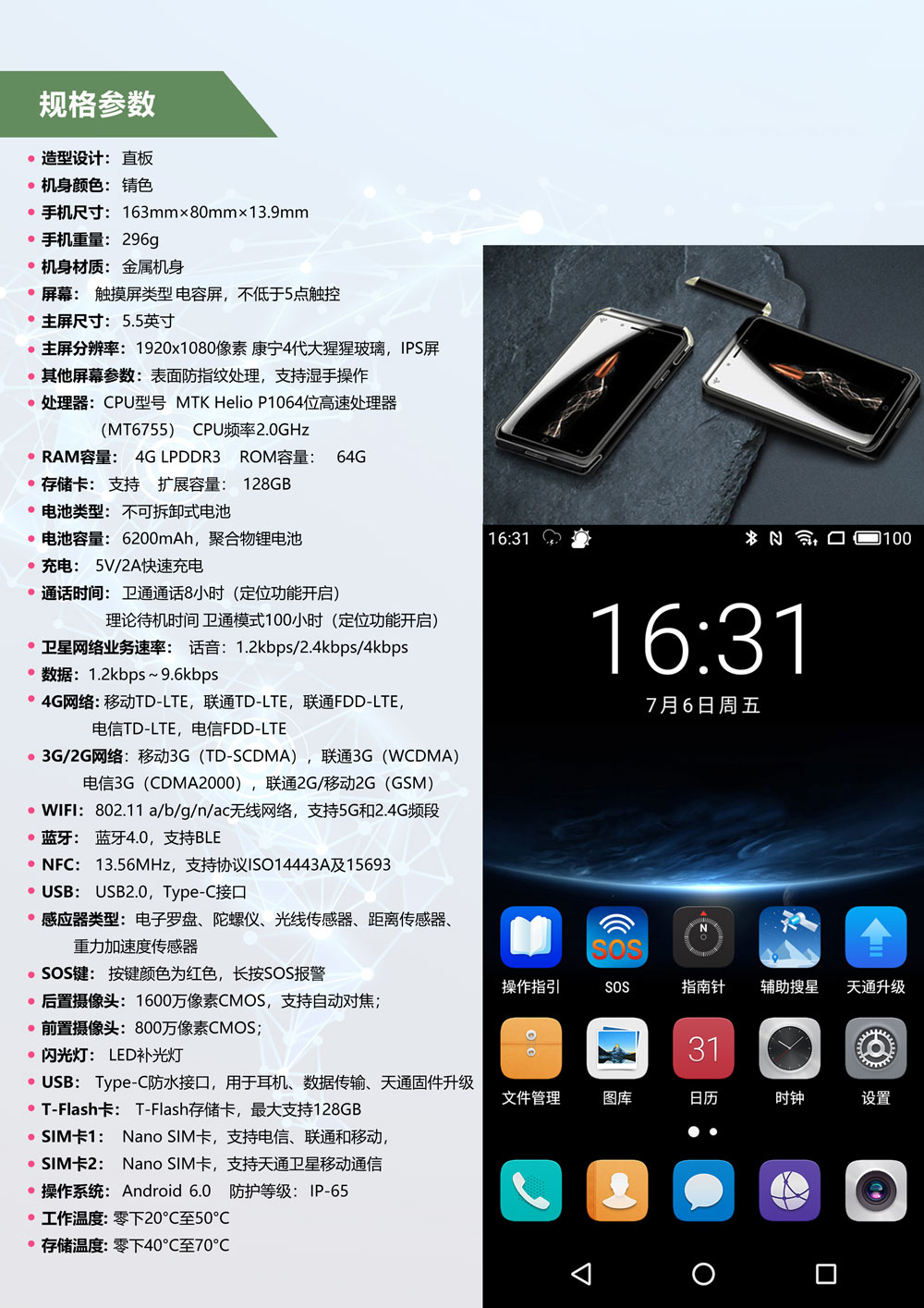 產(chǎn)品功能: ● 衛(wèi)星電話、衛(wèi)星短信、衛(wèi)星數(shù)據(jù)傳輸(最大9.6Kbps傳輸速率); ● 支持緊急呼叫; ● 全網(wǎng)通電話、短信和數(shù)據(jù)業(yè)務(wù); ● SOS一鍵呼救; ● 支持北斗B1/GPS L1雙模快速定位及位置跟蹤功能; ● 支持Wi-Fi、藍(lán)牙; ● 支持拍照和攝像、支持閃光燈功能。 產(chǎn)品特點(diǎn): ● 雙卡雙待,地面全網(wǎng)通與天通衛(wèi)星網(wǎng)絡(luò)無縫切換; ● 采用Andriod6.0操作系統(tǒng),可加載用戶定制App; ● 5.5英寸觸摸屏,操作便捷; ● 64GB機(jī)身存儲(支持?jǐn)U展,最大128GB); ● 輔助對星; ● 可靠連接、支持加密; ● 高話音質(zhì)量; ● 長續(xù)航能力; ● 三防設(shè)計(jì),支持IP65。