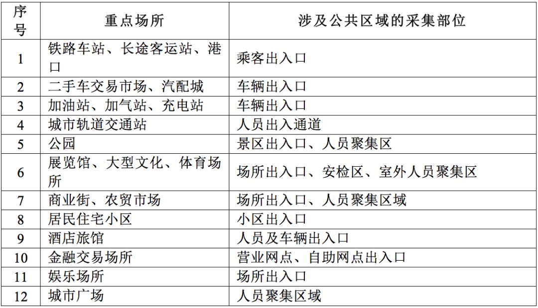 重點單位的特點:一是大多數(shù)單位的圍合程度較高,出入口較為集中;二是進出各單位的主體為車輛和人員。因此在重點單位場景下布設視頻監(jiān)控需覆蓋單位出入口區(qū)域,以掌握出入口處的車輛人員通過情況。 04 重點場所 重點場所包括鐵路車站、長途汽車客運站、二手車交易市場、汽配城、加油站、加氣站、充電站、城市軌道交通站、公園、體育館、商業(yè)街、農(nóng)貿(mào)市場、居民住宅區(qū)、酒店旅館,金融交易場所、文化宗教場所、娛樂場所等,以及市民廣場、紀念性廣場、生活廣場等城市廣場。重點場所涉及公共區(qū)域的采集部位如下表所示。