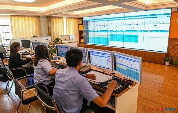 在海口公交智能調(diào)度中心,大屏幕上可以及時清晰地觀察到每輛運營車輛的信息。圖片來源:海口日報