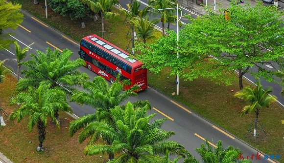 一輛雙層觀光巴士在龍昆南路上行駛。圖片來源:海口日報