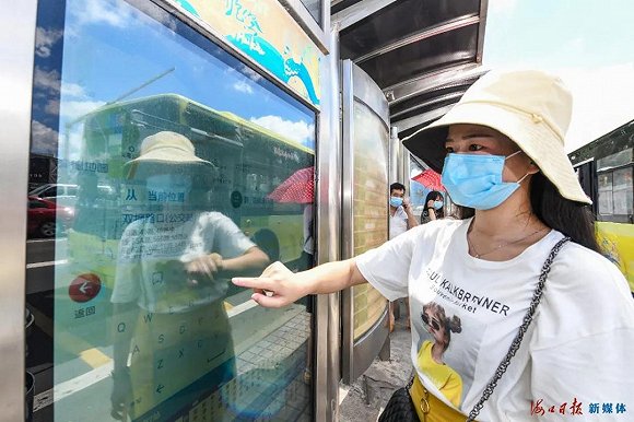 在鐘樓站,乘客利用電子站牌查詢搭乘車輛信息。圖片來源:海口日報